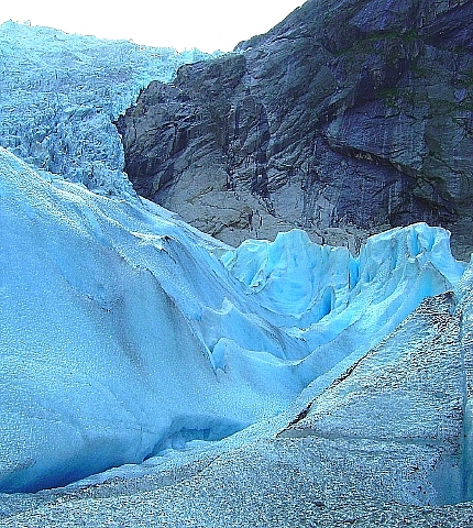 ブリクスダール氷河(Briksdal Sbreen) Part 3海抜1700mの地点から始まり2500年前に現在の形になったそうです。ロックフラワー氷河は重みで下にズリ動く時、沢山の岩を砕いて巻き込むので、その溶けた水には沢山の微粒の岩を含んでいるそうです。それが「ロックフラワー」らしい。(「氷河氷のロック割り」は想定外に砂だらけ? )光のプリズム効果(屈折反射)で氷河を青く見せたり、氷河の水で出来た川を乳白色にしたり、湖が緑に見えたりするのはロックフラワー効果のようです。波長の短い赤やオレンジは吸収され、波長の長い青や紫がはねかえる。波長の最も長い紫色にならないのは、一部吸収されるので、青から緑ではねかえって来るから・・。光の強さにより色は微妙に変化するので、少し曇っていた方が雲がフィルターの役目を果たして緑や青は良く映えるようです。当然見る角度によっても色は変化する。氷河の端っこ。これが全て溶けたら下はスベスベ岩肌ですかね。下は相当な圧がかかっている事でしょう。見ただけでキシキシしてる感じです。蘇生と昇華氷河氷が出来るのが蘇生、下(舌部)で氷の溶けるのが昇華。蘇生>昇華 氷河が下方に向けて膨らむ。蘇生<昇華 氷河は溶け出して後退する。ブリクスダール氷河の末端(氷舌端)は、~1760~1770年にかけて最も長かったようです。それが、以降1952年までに後退してから再び前進して1992~1996年まで+278m長くなったそうです。(1日15~20cmの割合で)氷河の末端(氷舌端)氷河が青く見えるのは、雪が圧縮される時に一緒に細かい塵などを入れ込み、これ がロックフラワーの役割を果たしているからだそうです。氷河の青はグレーシャーブルーと呼ばれる。1991年にアルプスにあるイタリア・オーストリア国境のエッツ渓谷(海抜3210m)の氷河で見つかった、約5300年前の男性のミイラ、アイスマンのように、昔氷河に落ちて閉じ込められた人が氷舌端が溶けて出てきたりするといいますが・・。前回紹介したように、氷が伸ばされたり押しつぶされクレバスができ、とくに急な勾配を氷河が通過する時、氷河がクレバスによってズタズタに割れたりするのですから、よほど運が良くないと完全体では出てこないはずです。溶け出した氷河が流れて行きます。きれいな氷塊です。氷河が前進すると言う事は、流れ出る水量が減ると言う事です。海抜340mのブリクスダール瑚(氷河湖)が大きくなるか小さくなるかは氷河の溶け具合のようです。氷河湖は細かい石の破片が水に入った光を散乱するので見事なエメラルドグリーンから暗く濃いブルーまで様々な美しい色を見せるのが特徴です。つづく