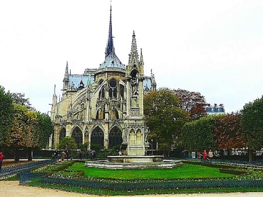 パリのノトールダム大聖堂は、サンティアゴ・デ・コンポステーラ巡礼の重要な起点の一つ。かつては隣接して巡礼者の宿泊所もあったらしい。※ スペインのサンティアゴ・デ・コンポステーラ(Santiago de Compostela)はエルサレム、バチカンと並ぶキリスト教三大巡礼地の一つであり、そこに至る巡礼路は決まっているのである。それは四国巡礼のお遍路さんの旅に近いかも。2011年5月から「サンティアゴ・デ・コンポステーラ巡礼 」を書いています。ショートで1~14回です。事情があり、中断して中、別の物をはさみながら書いていますので6か月かかってしまいました。リンク先は3つだけのせます。リンク サンティアゴ・デ・コンポステーラ巡礼 1(巡礼)リンク サンティアゴ・デ・コンポステーラ巡礼 13 (聖ヤコブの棺、聖なる門)」リンク サンティアゴ・デ・コンポステーラ巡礼 14 (ボタフメイロ・プロビデンスの眼)最初、南と北のバラ窓の写真の区別が付かなくて苦労しましたが、ちょっとした法則が解ってからはサクサク分類、一見同じに見えていたステンドグラスですが、新旧の差か? 技法の違いか? 作家の違いか? かなり異なります。写真の枚数を増やして細部を紹介したので今回も入りきりませんでした尚、写真は昔のを拾い集めているので季節も一緒くたです。一番近々に行った時はノートルダムに寄らなかったので残念な事をしました。良いカメラで撮影できていないのです。だから細部の拡大に限界があります。最もブログ用は解像度をかなり低くしているのでなおさらですが・・。ノートルダム大聖堂の悲劇 3 外周と北翼のバラ窓ノートルダム大聖堂(Notre-Dame de Paris)南の翼 側聖堂裏 側 後陣北の翼 側北翼のゲート(クロワートルのポルタイユ)ル・シュヴァリエのステンドグラス北のバラ窓前回、西の聖堂正面の紹介をしたので今回は南側面、聖堂裏、北側面とまずは外側の紹介から入ります。写真を選定する為に細部を見ていて気づいた事が幾つかありました。それはノートルダム大聖堂の一番の見所が北側とその翼にあったと言う事です。ノートルダム大聖堂ができた当初からのデザインがほぼそのまま残っている箇所が北の翼なのです。特に北のバラ窓は貴重です。(南は1841年以降の改修でできたようです。)そして今回の火災写真と照合して、南のバラ窓の上の小窓は枠ごと破壊されていて、下は恐らく無事。また北のバラ窓も恐らく無事。ただしこちらも上の小窓は枠(トレサリー)は残っているけど火災の衝撃でガラスは破損。そんな風に見受けられました。南の翼 側南の方は、前回1841年の修復問題で、ヴィオレ・ル・デュク( Viollet-le-Duc)(1814年~1879年)の勝手なデザイン変更の事に触れましたが、まさに南のバラ窓は北とは大きくデザインが異なっているのです。誰かがヴィオレ・ル・デュクのデザインは偽ゴシックだと言ってますが、確かに南のバラ窓の枠はゴシックの意匠ではありません。内部のステンドグラスからだけだと解りかねますが・・。こちらはゴシック(Gothic)ではなく、例えるならレース編み(Lace knitting)のデザインのバラ窓の枠(トレサリー)です。残念ながらこちら南の翼のポルタイユは至近撮影できませんでしたが、聖ステパノに捧げられたポルタイユ(Portail du St. Etienne)がある。大聖堂建設前からここが聖ステファノ(St Stephen)に捧げられた聖域だったそうだ。聖ステファノはキリスト教、最初の殉教者である。確認していないが、ポルタイユのティンパヌム(tympanum)だけは13世紀の物らしいが、その周りやトリュモーの像などは19世紀の作品。尖塔の拡大写真がなくて残念でした。尖塔は意外にも鉛でてきていたそうです。火災で焼け落ちたのも道理。そしてその為に鉛害が発生しているらしい。(ステンドグラスも鉛で留められているけどね。)また、屋根の上、尖塔基部を囲むように1841年以降の修復で12使徒らの像が付加されていた。問題は、その聖人のモデルに自分を含む仲間達がモデルとなっていた事だ。屋根の上にいる12使徒の1人、聖トマス(Thomas the Apostle)のモデルはヴィオレ・ル・デュク自身らしい。聖トマスは建築の守護聖人だから自らを重ねたのかもしれないが、同時に聖トマスは変わり者でもあった。聖画では、イエスが刺された脇腹に本当か? と手を突っ込んで確かめたと言うエピソードがあり、疑い深い人でもあったようだ南側のバラ窓も前回紹介した1841年以降の修復でヴィオレ・ル・デュク( Viollet-le-Duc)(1814年~1879年)により新たに造られた火災後の写真で確認できる限りだが、上の小窓のステンドグラスは枠も破壊されていた。後で比較を載せるがヴィオレ・ル・デュクはなぜ北と違うデザインのバラ窓にしたのだろう。13世紀当初に復元するのが元の計画だったのに・・。聖堂裏側 後陣聖堂裏にあるジャン(ヨハネス)Jean-XXIII(23世)公園から撮影手前にあるのは1844年に建てられた聖母の噴水(Fontaine de la Vierge)かつては、この位置に大司教館が建ち並んでいたが、1789年の革命時に教会の全
