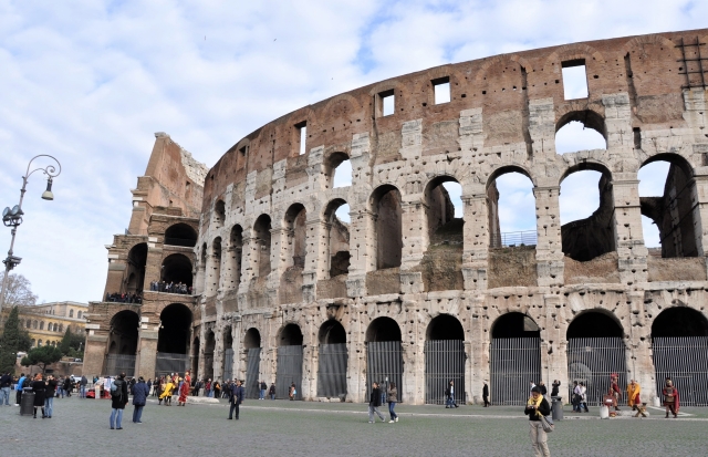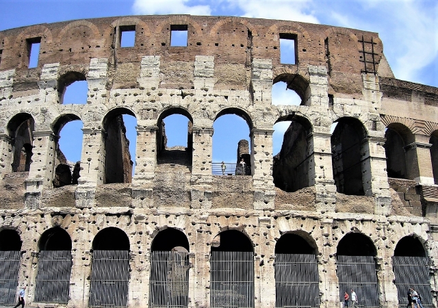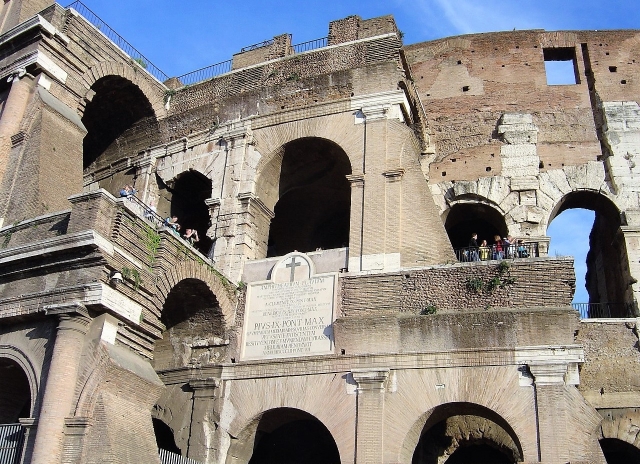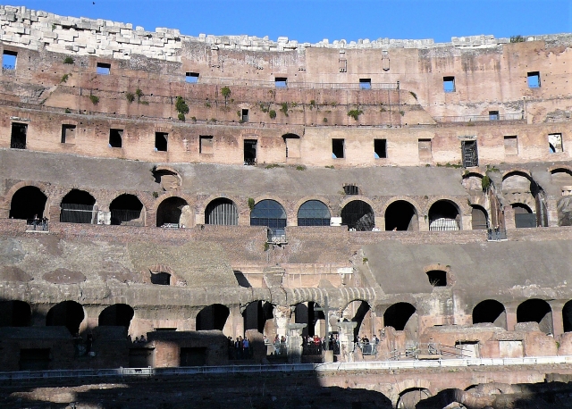 コロッセオ外側には各層80のアーチが並んでいる。1層目はドーリア式、2層目はイオニア式、3層目はコリント式の付け柱で飾られ、4、5層目は明かり取りの窓が交互に開けられている。1層目のアーチには番号が付いていて、入場者はチケットNoのアーチから入場したそうで、(全く現代のシステムと一緒)5万人規模の入場者を効率的にさばく事が計算された造りなのだそうです。