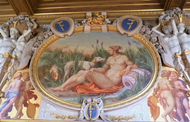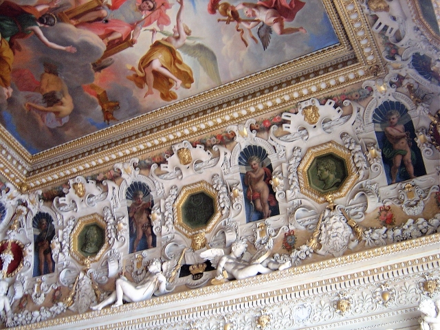 ローマに留学していた画家ルイ・ル・ブランは内装を担当。彼もまたローマ・バロック様式を取り入れ、天井装飾は、スタッコ装飾またはトロンプ・ルイユ(だまし絵)の技法による額縁に縁取られた天井画が描いているそうだ。