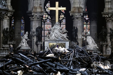 まるで爆撃のようだったと言うノートルダム大聖堂の尖塔の崩落。しかし、聖堂の中から金色の十字架とマリア像が見えた時、奇跡? と思った。下は火災前のピエタ像