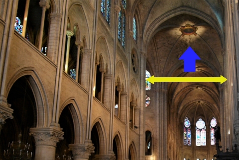 下、青い矢印はクロッシングの天井。落ちた部分。黄色の矢印は翼廊部。