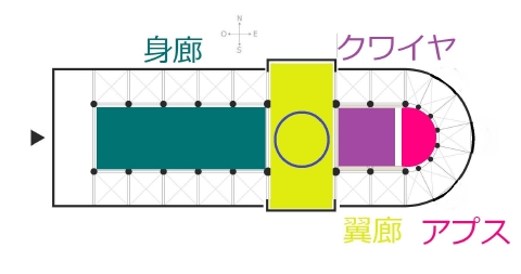 下は大聖堂の構造図を元にザックリですが、ノートルダム大聖堂の配置図を載せました。
