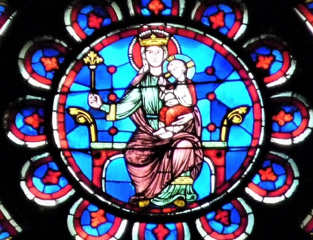 ファサードのバラ窓は西に位置し、まさに中心には幼児イエスを抱く聖母の姿である。