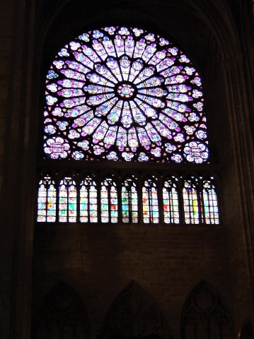 直径13mのバラ窓は正面ファサードのバラ窓よりも大きい。その下の長い窓と合わせると採光部は18mに達する。それは1248年、先にできた王宮に付随するサント・シャベルの経験が生かされ、より袖廊より採光が取り入れられるよう研究された結果らしい。