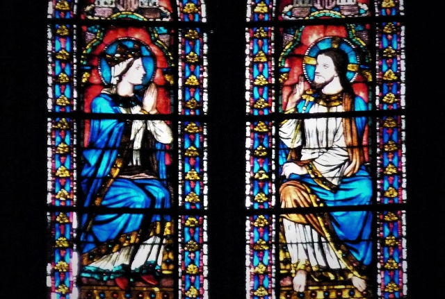 こちらはかなり古いステンドグラスかもしれません。マリア様がちょっと険しい顔してます。