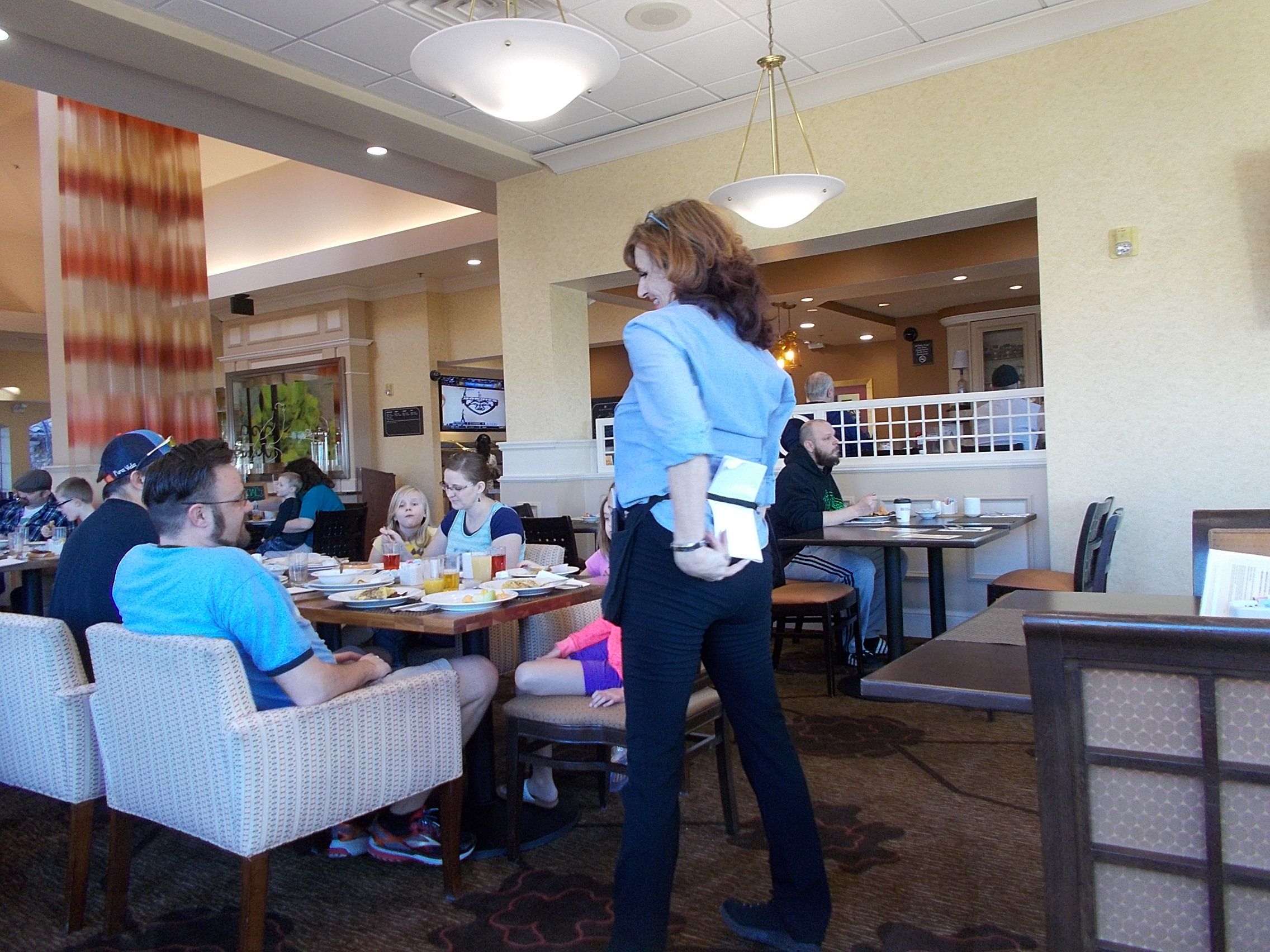 今年(2018年)から、チェックインの時にくれた朝食券が廃止され、ヒルトンメンバー(ゴールド・ダイヤモンド)は、レストラン入り口で名前を言うようになりました。ここではこの女性が名前の確認をしていました。2018年4月からヒルトンメンバー特典の変更が行われますが、既に始まっているようです。詳しい事はわかり次第、報告します