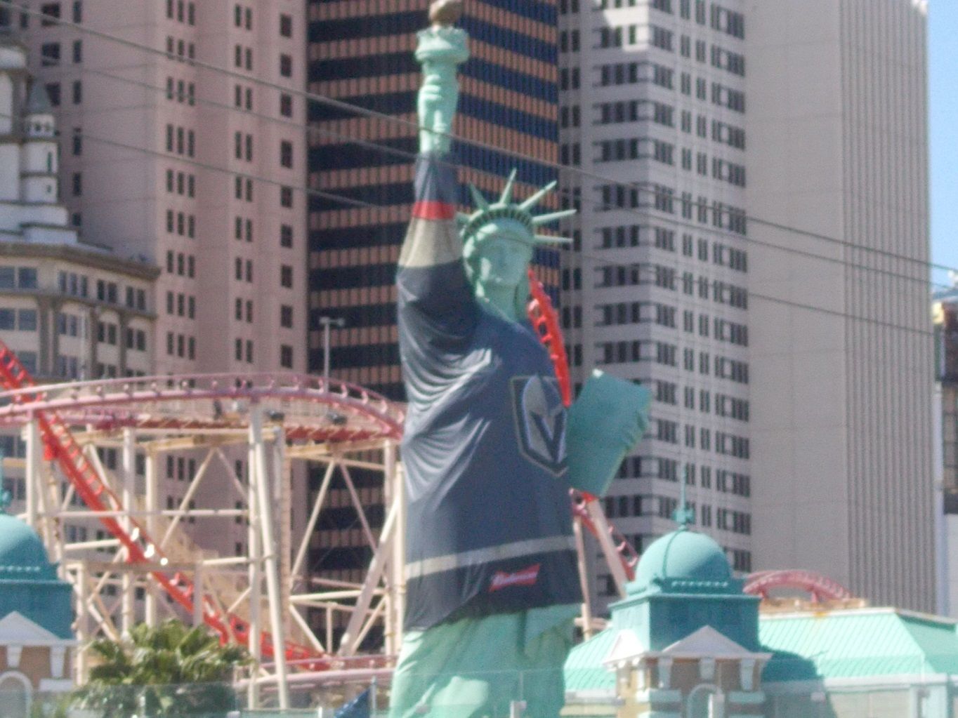ニューヨーク・ニューヨーク自由の女神像もゴールデンナイツのユニホームを身につけて飾られています
