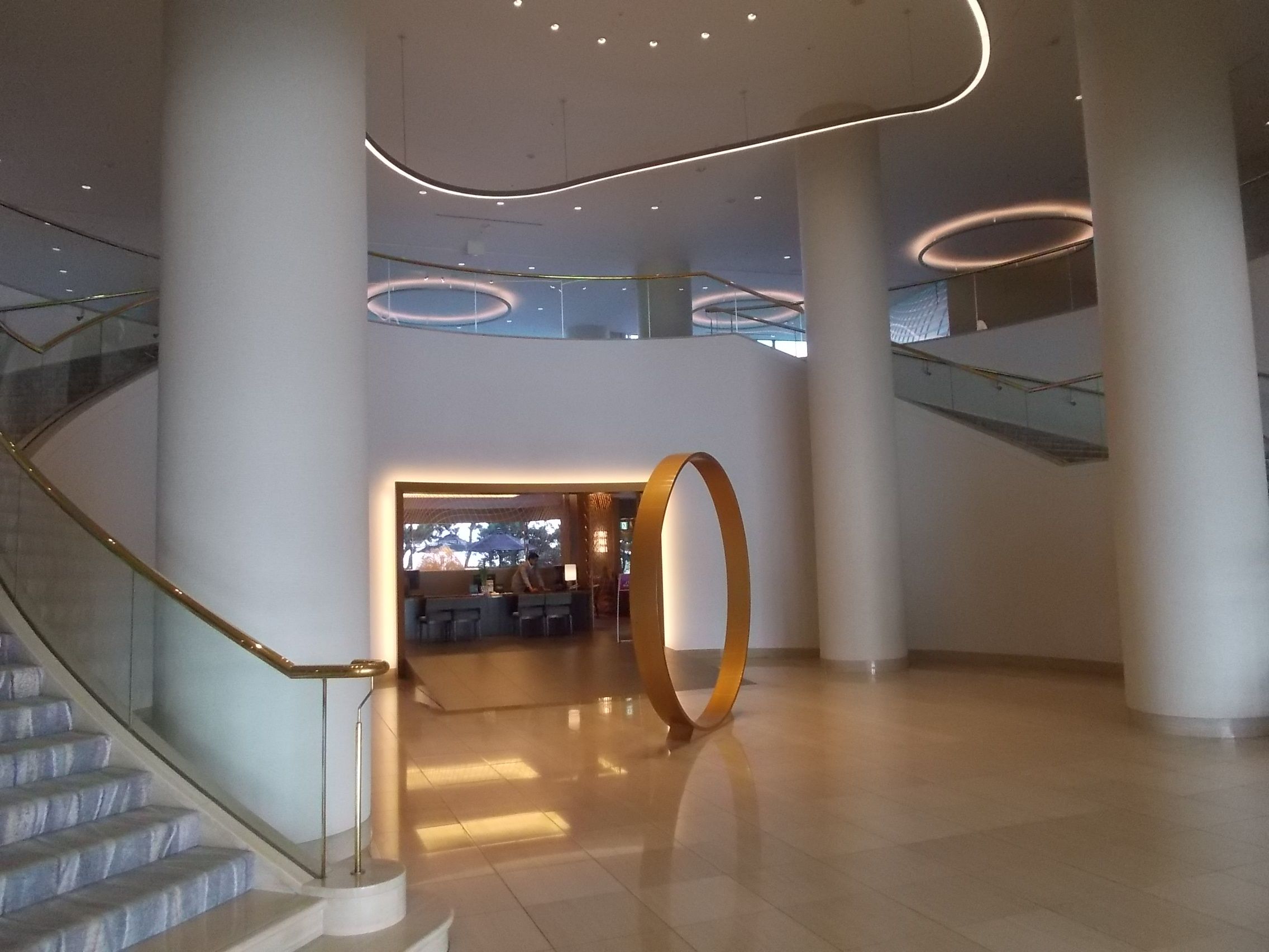 ホテル正面入口前の、ゴールドリング・オブジェ、