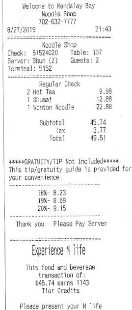 マンダレイベイ・ホテル「The Noodle Shop」2019年8月27日夜、