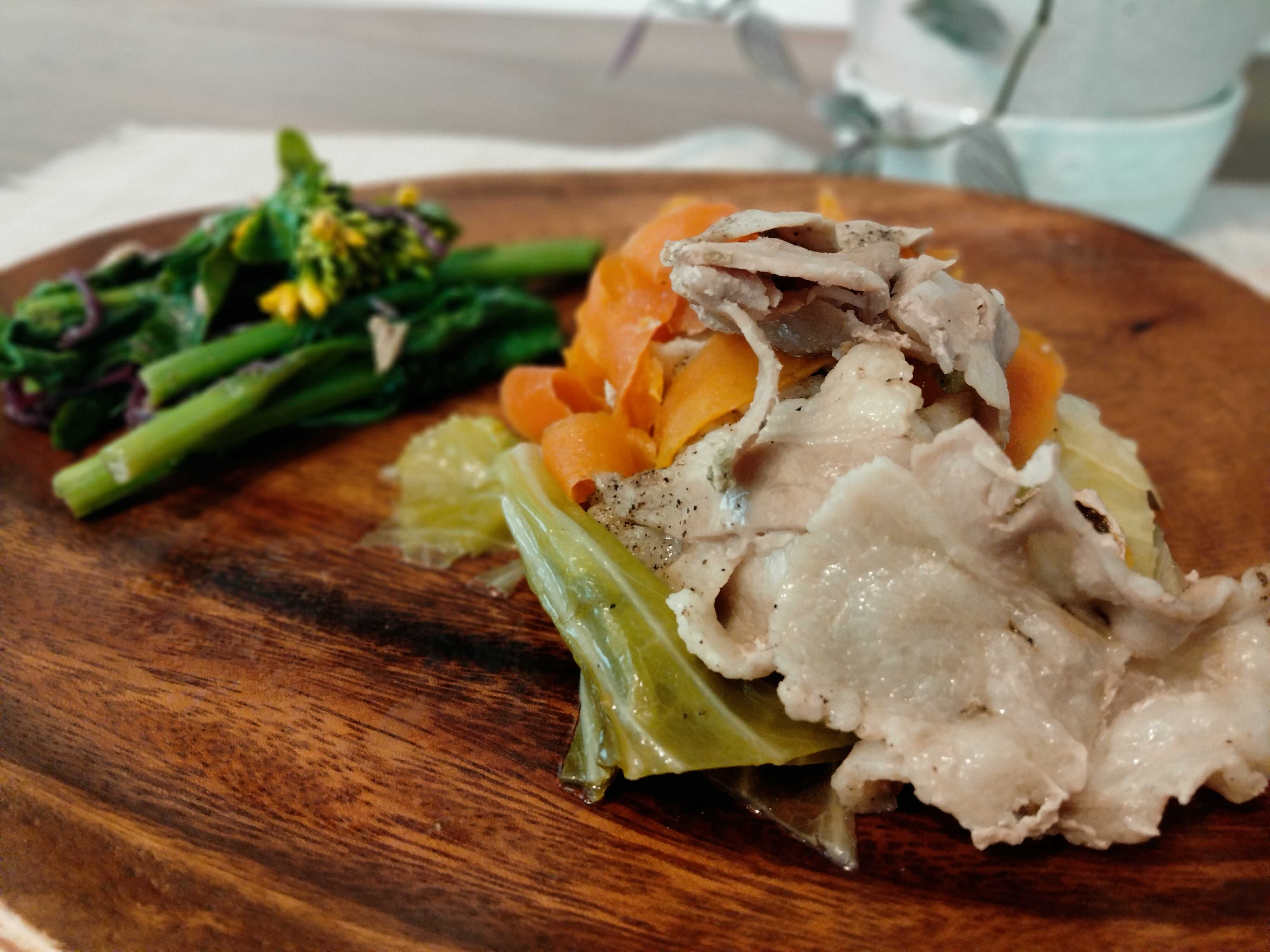 毎日料理する方料理が得意な方、苦手な方、時間がない方怪我した方(私😅)やっぱり便利です今夜も登場そしてほぼ同じメニュー😅包丁が使いにくいのでキャベツはざく切り人参はスライサー味付けはコンソメ+とろろ昆布+ハーブソルト+胡椒モードは60の「白菜と豚バラの重ね煮」30分で完成添え物に菜の花の和物レンジで1分半チン→紫キャベツのピクルス+ツナ缶、少しの塩で調節出会えるだけ辛子があれば良いね~