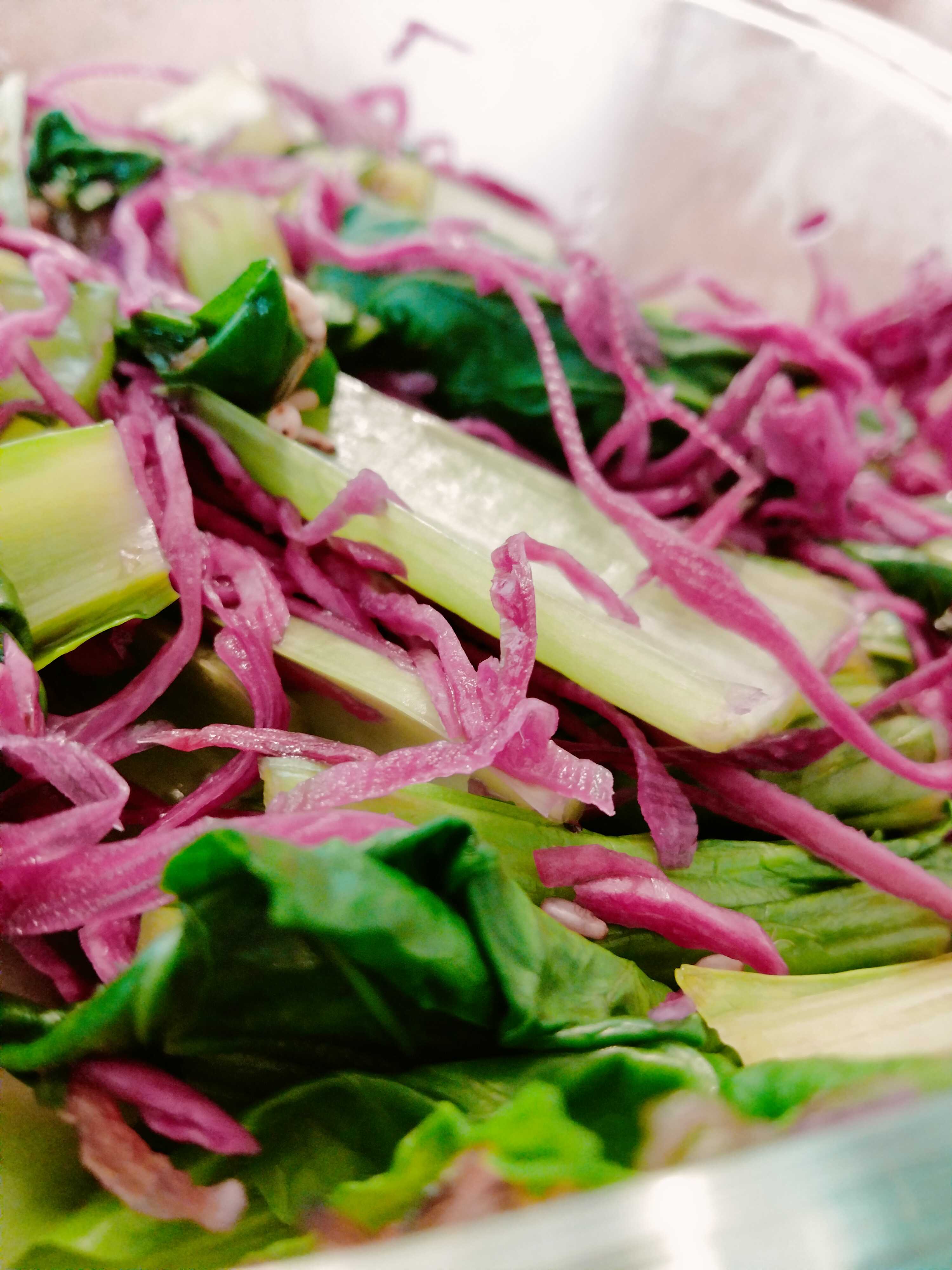 夕ご飯用に惣菜準備小松菜をレンチンザクザク切ってさっと洗ってシリコンケースに入れるレンジ600wで少ししんなりするくらい(今日は4分くらいかな)レンジから取り出してシャカシャカ紫キャベツピクルスを乗せる生のしらすふりかけをかける混ぜる蓋をして味をなじませたら完成簡単すぎる