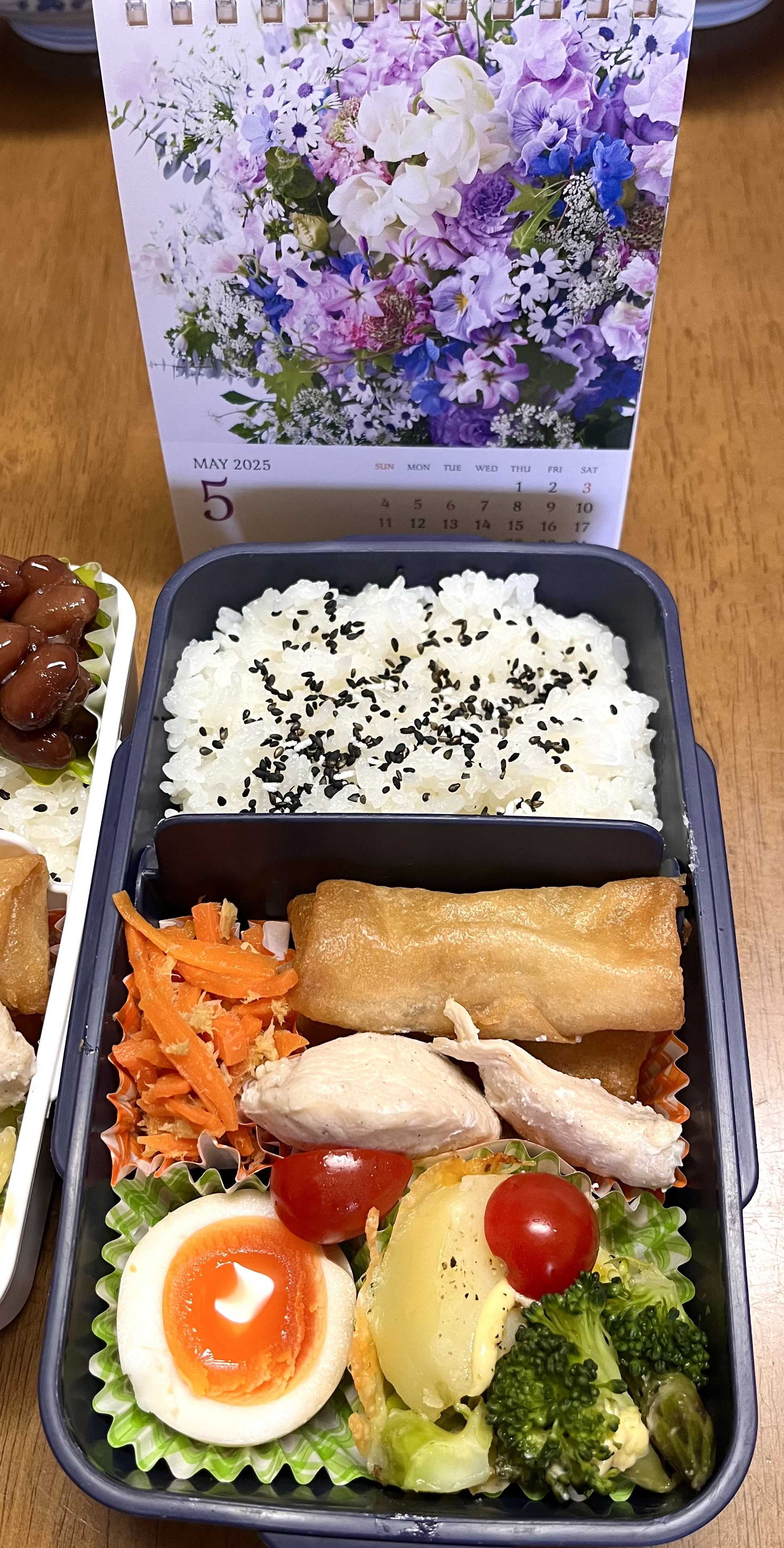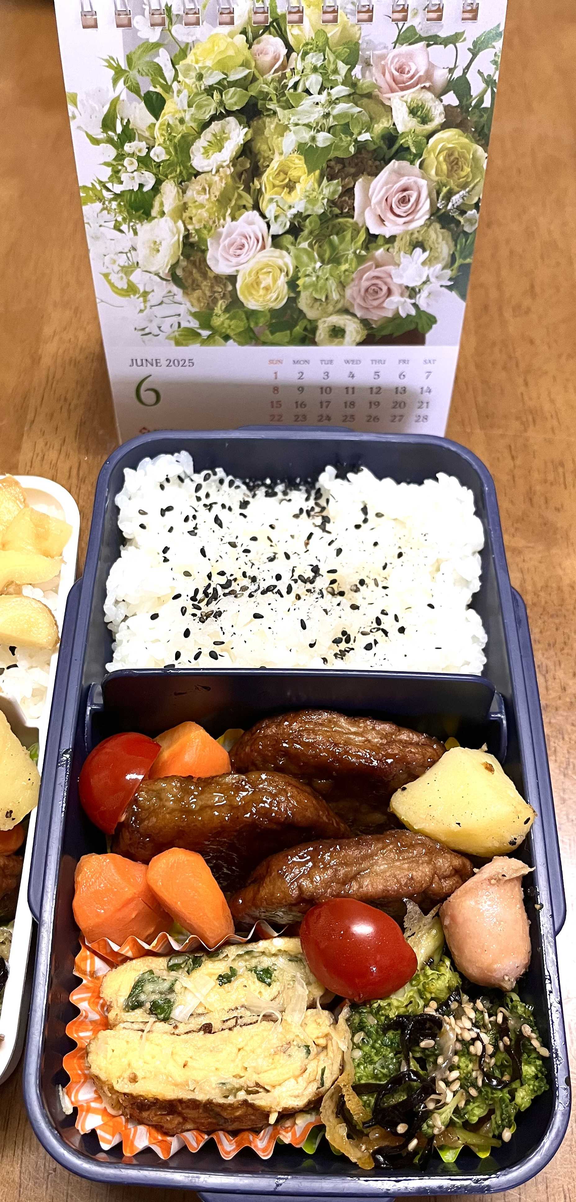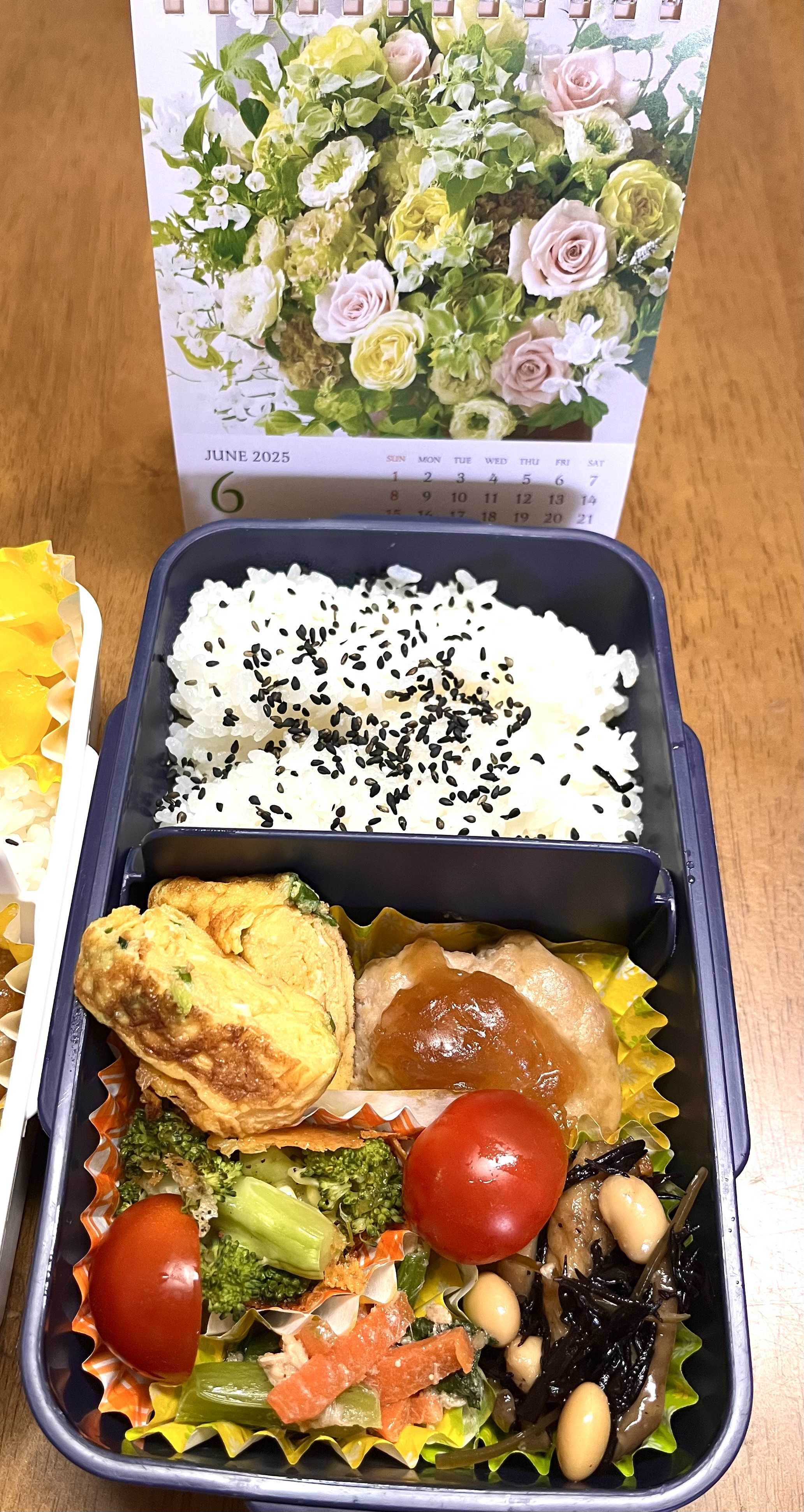 5月26日(月)。🍀回鍋肉弁当。りん、高校総体まで最後の練習週。部活の送り迎えもあと少しで終わるのか‥。この日は学校までお迎え。5月26日(火)。🍀オムライス弁当。私のお弁当はなし。この日はDr.からのご馳走でケンタッキーランチでした💓💕。私は参加組みじゃないけど、学校歯科健診。今年は学生数1300人診る大きな健診行事。5月28日(水)。🍀鳥唐揚げ、アスパラベーコン弁当。前日とこの日、アリーナお迎え。りんの練習もあと少し。がんばれ👍。5月29日(木)。🍀ドライカレー弁当。5月30日(金)。🍀サンドイッチ弁当。高校総体始まり〜。この日はアリーナで練習のみ。自宅からアリーナまで自転車🚲で行った様子。1時間ちょっとかかる😱💦。高校生なら大丈夫か👌。5月31日(土)。🍀おにぎり焼肉弁当。ソフトテニス🎾、1日目。団体戦。がんばれ👍。6月1日(日)。🍀おにぎり唐揚げ弁当。2日目、個人戦。りん、この試合で引退。しきりに引退したくない😢。って言ってる。楽しかったみたい。3年間よく頑張った👌。
