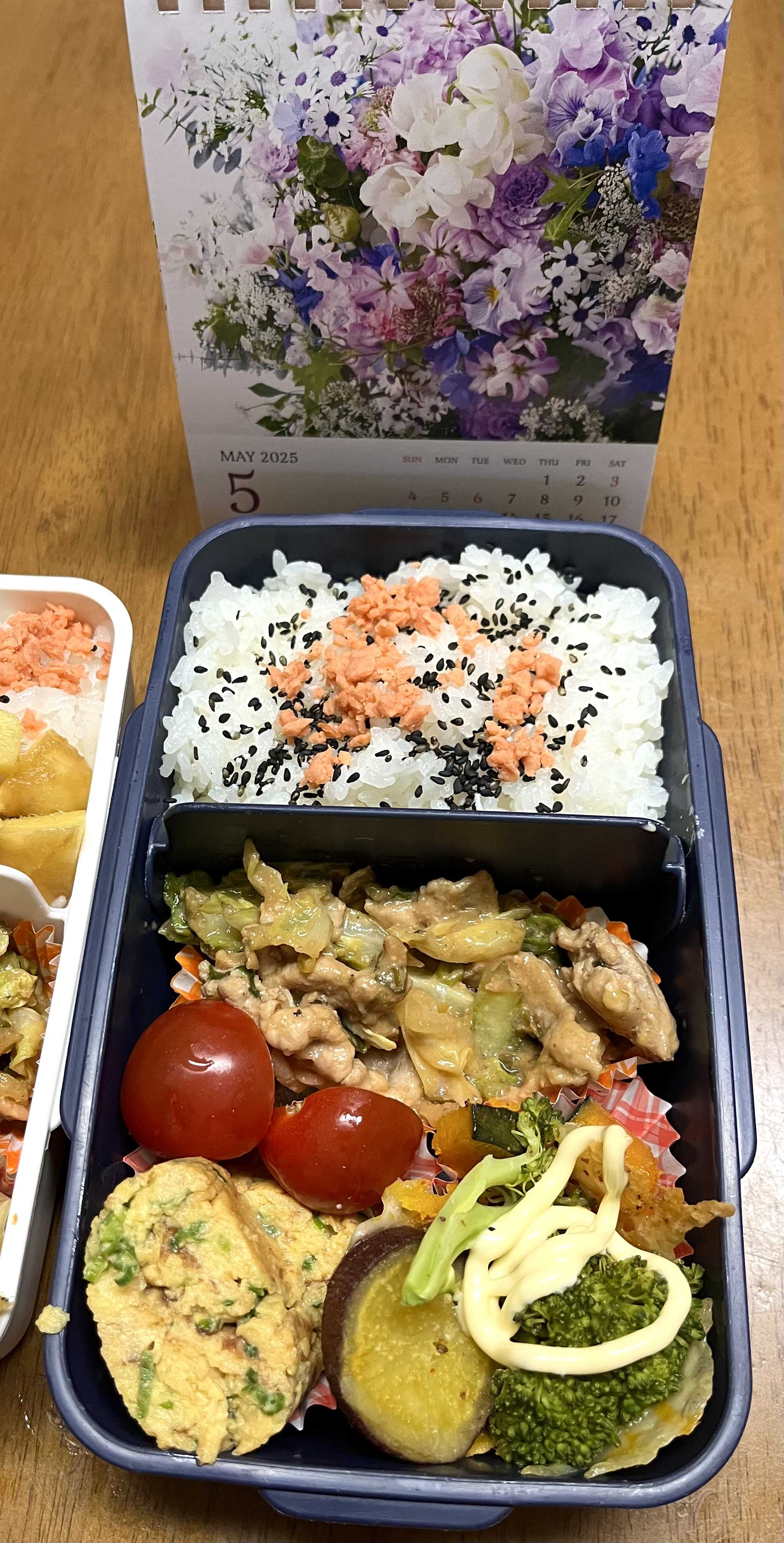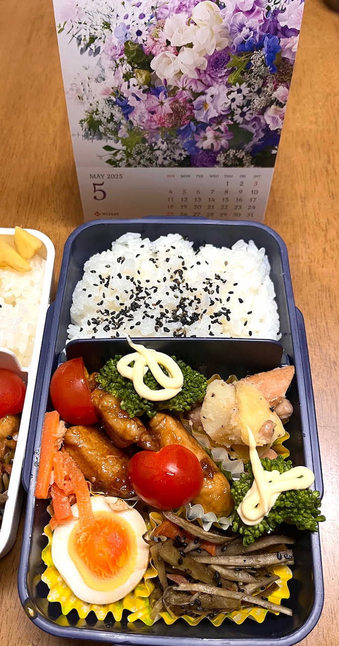 4月14日(月)。🍀親子丼弁当。りん、なんだか鼻水グズグズ😰。土曜日、テニスの大会、ちょっと肌寒かったし。日曜日もお出かけしてるし。4月15日(火)。🍀焼肉弁当。りん、やっぱりダウン⤵️。学校お休みしました。鼻水が止まらない😱。しかも頭痛🤕。4月16日(水)。🍀鶏チーズピカタ弁当。りん、この日もダウン⤵️。欠席。鼻水の症状、アレルギー含めて私はほとんど出ないから、代われる物なら代わってあげたい親心‥😢。休んでても食欲はある。これは良かった👍。やっぱり食べて寝ること大事👍。4月17日(木)。🍀塩焼きそば弁当。りん、本調子じゃないけど、これ以上休んでられない😱。って、学校に行きました。4月18日(金)。🍀鶏照り焼き弁当。写真はエラーで載せられず😰💦。この写真は後日。⇨。載せること出来ました😋。この日は高校の授業公開日。私は張り切って有給休暇とりました😅。りんから、来なくていいよ。むしろ来ないで‼️。来るな‼️の直前ラインも来たんだけど‥😢。私にとってはもうなくなる子供の行事。絶対行かないと👍。って思うんだけど‥。見にきた親、私含めて3人。高校三年生にもなると、みんな観に来なくなるのかな?平日だからかな?去年までは土曜日午後だったし。ギャラリー少なく、しかも自分の親がいる。確かに嫌だったろうな‥。案の定、りんは帰宅後大層ご立腹💢。『来るな‼️。って言ったよね‼️。』『直前にもラインしたよね‼️。』そんなに親がくるの嫌なんだろうか‥😭。というわけで、私は金曜日から三連休💕💕💕。お料理&パン作り&ミシン作業、楽しみました💕。まずは〜、パン作り。久しぶりのプルマンブレッド。1.5斤型で作りました。発酵前↓。発酵後↑。焼き上がり〜。ランチにサンドイッチ作りました。卵サンド、ハムチーズサンド。レタスなかったんだよ😰。出来上がり〜。フワッフワの美味しいサンドイッチでした😋。あっという間に完食〜。美味しく出来たので、調子を上げて、(ちょうど食パンストックが少なくなってきたので、)2斤型で作りました。発酵前↓。発酵後↑。焼き上がり〜。あー、天井まで届かなかった😓。普通の山型食パンになっちゃった😱。パン教室レシピじゃなくて、私のお気に入り先生レシピで作ったんだけど‥。ベーカズパーセント、4.2倍で。ん?なんか少ない気がする。って思ったけど、そのままレシピ通り作りました。案の定、やっぱり足りなかった😅。味は美味しいので、(ふわふわしっとり)次作る時はもう少し多めの倍率で作ろう👍。やっと洋服作り再開。久しぶりにミシンさわったけど、このタイプのお洋服は初めてじゃないから、手順大丈夫だろうって思って取り掛かるが‥。ん?この縫い方何?とか、裏表逆に縫ってる⁉️、とか、いろいろハプニングがあり、ミシンかけてはほどいて、アイロンしなおしして〜。の繰り返し😓。しかも布地が黒だから、見えにくい〜。老眼確実に進んでます🫤。自分の仕事用中近両用眼鏡必須です。明らかに20代の頃にお洋服作りに没頭していた時より、効率下がってます😰💦。この作品、仕上がるかどうかかなり不安😭。