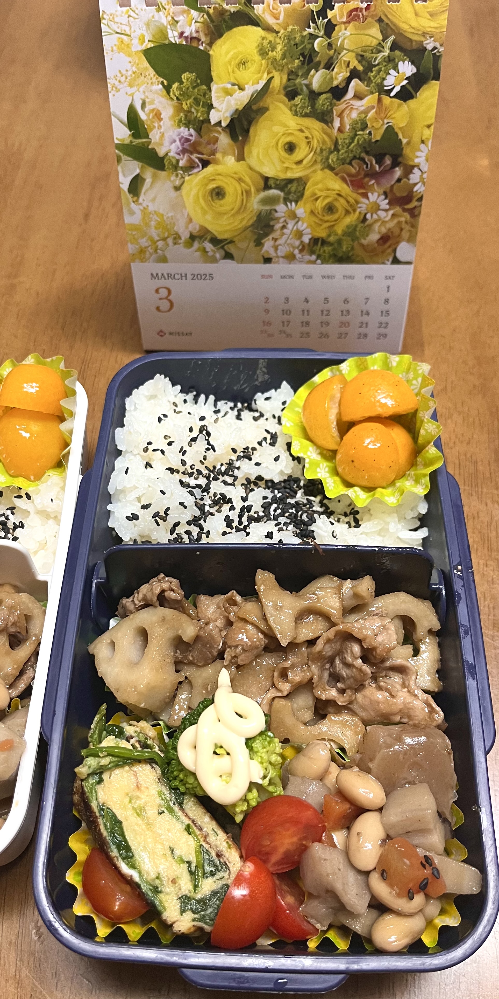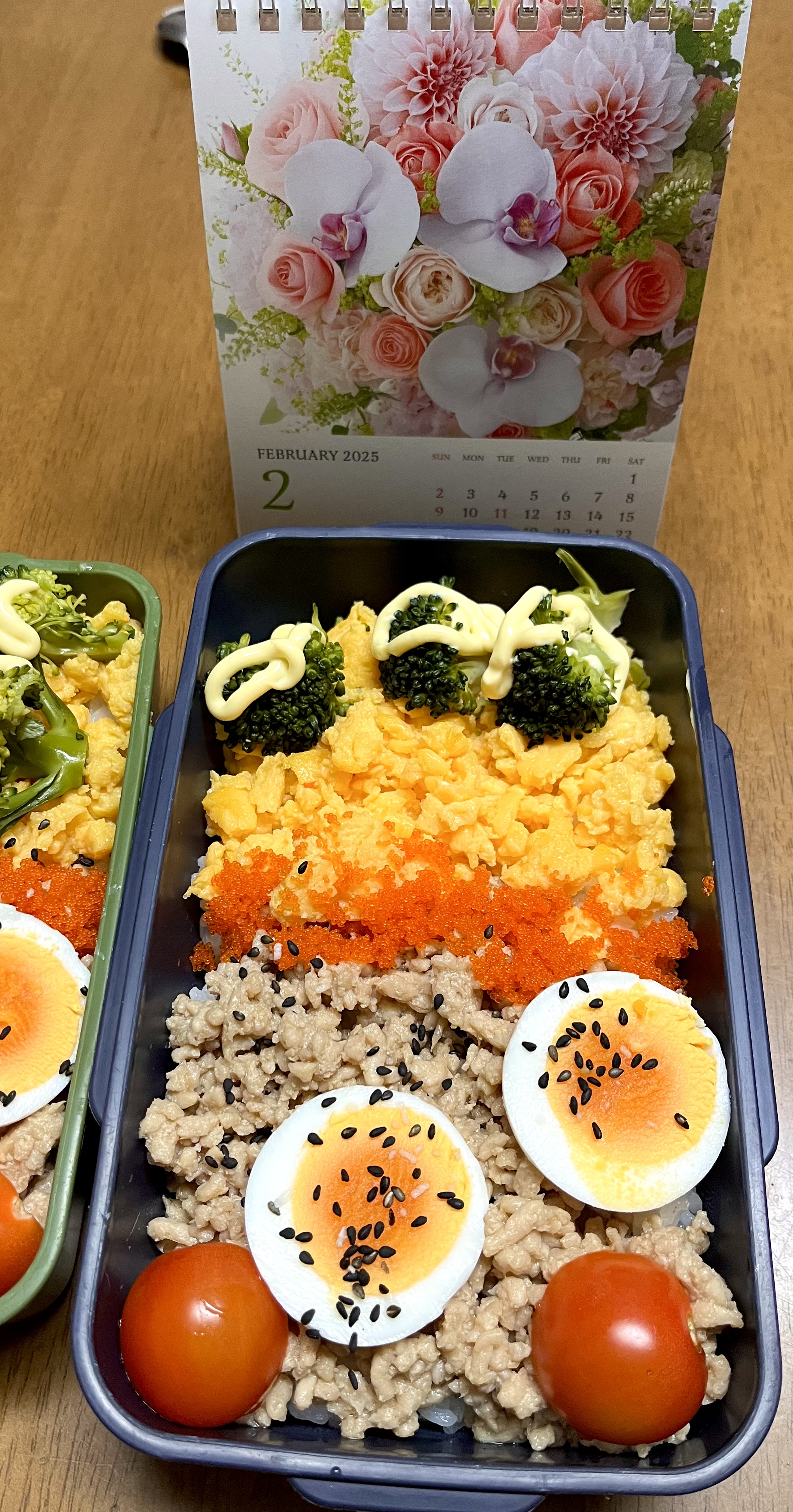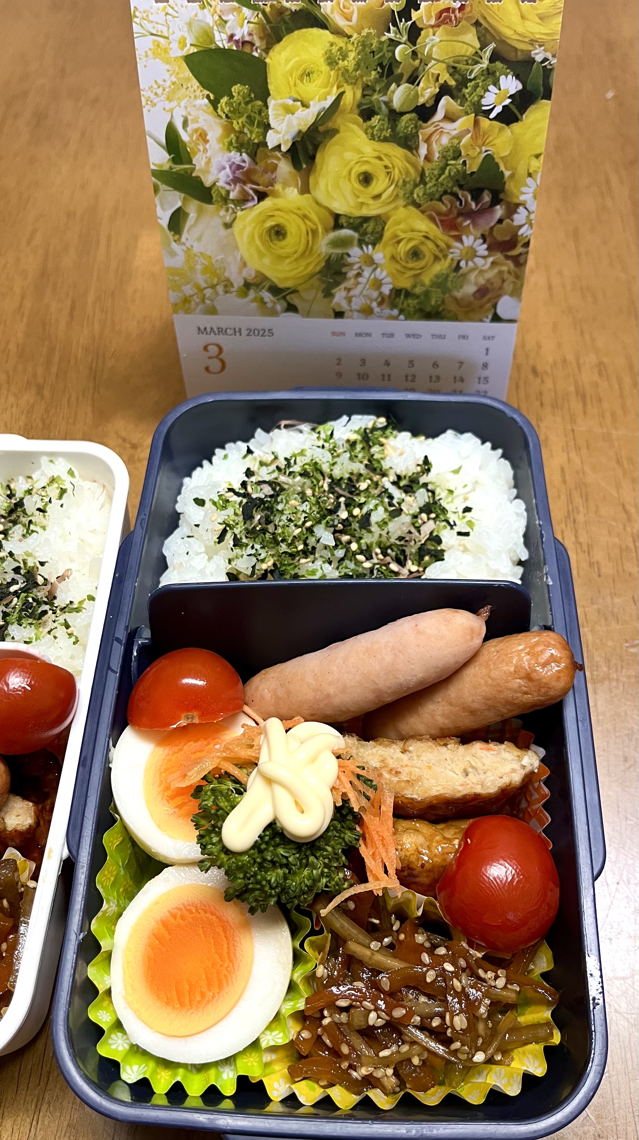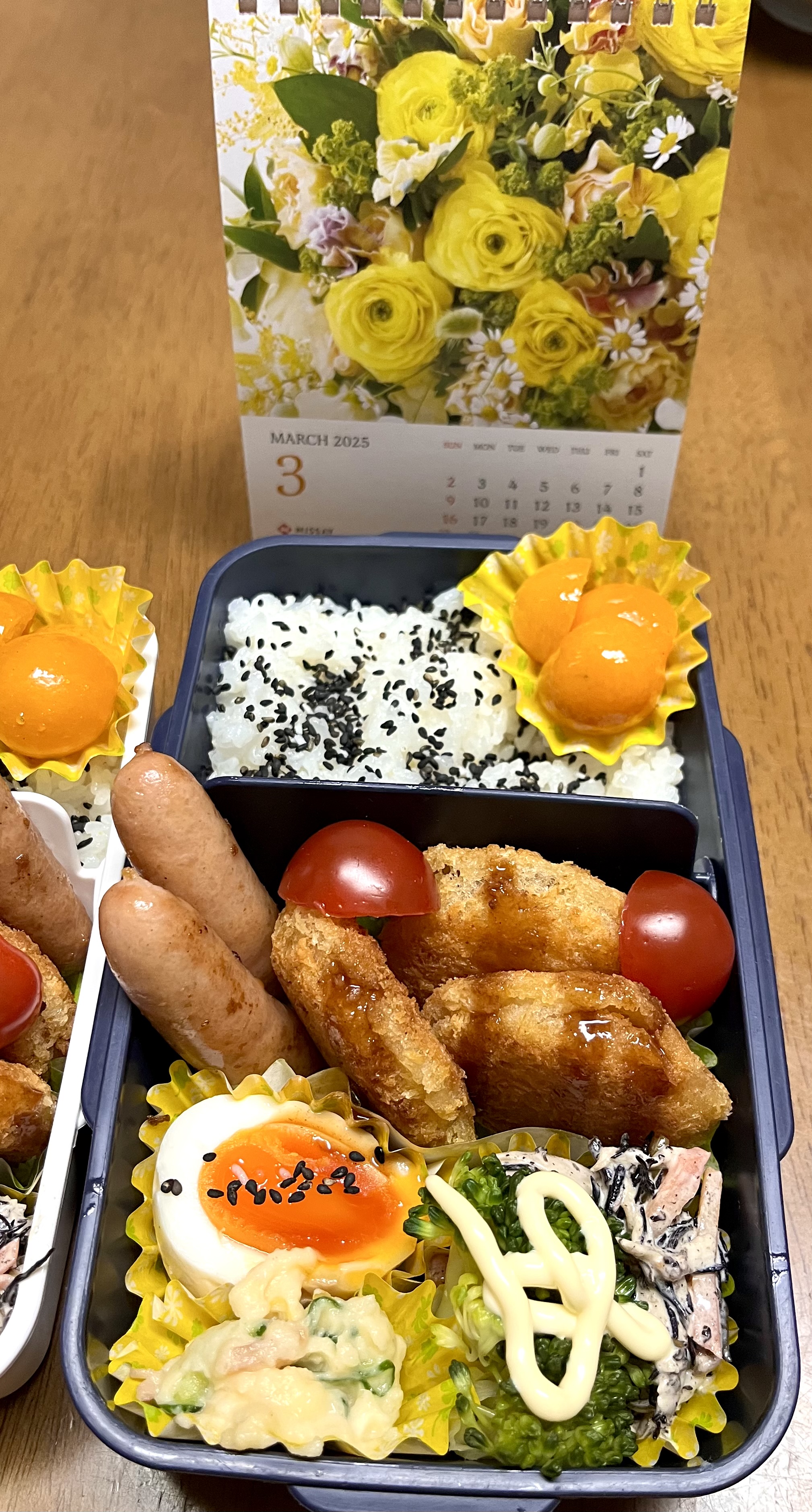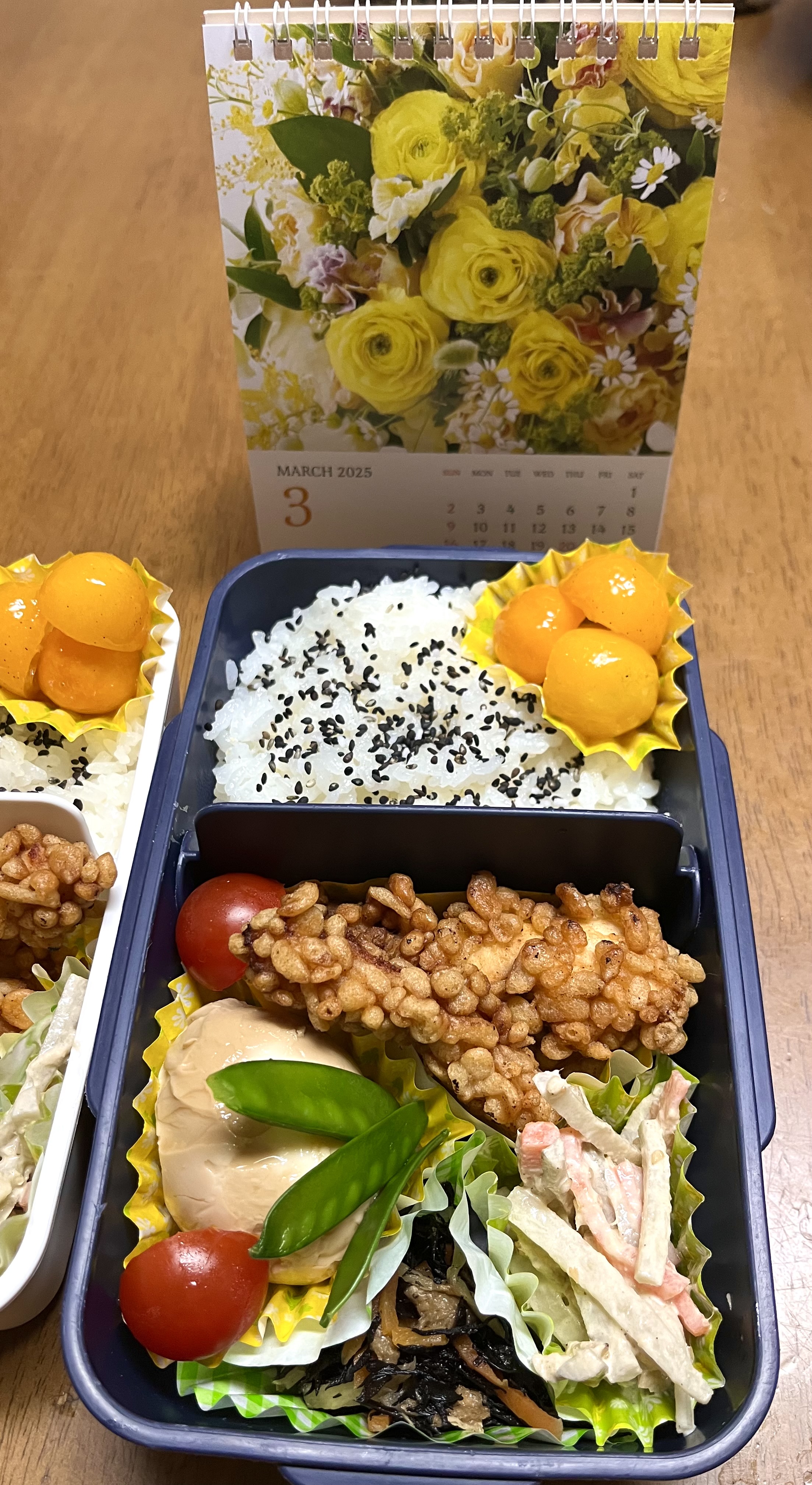 2月25日(火)。🍀鶏むね青のりマヨ焼き弁当。2月26日(水)。🍀豚玉ねぎ焼肉弁当。2月27日(木)。🍀ドライカレー弁当。2月28日(金)。🍀親子丼弁当。3月1日(土)は甥っ子ちゃんの卒業式。(甥っ子ちゃんとりんは同じ高校。)。今年は1、2年生の在校生も普通に参加だから、コロナ前の式に完全に戻ったかんじ。朝、りんのこと学校まで送ってきました。なんかいつも来ている高校だけど、来年はりんかぁ。って思ったら、運転しながらウルウル🥹してきました🥲💦。妹になんで⁉️って言われたけど😱。私、『母ちゃん叔母さんとして参加しちゃだめかな?』りん、『ダメでしょ、何言ってるの😕。』妹、『各家庭、2名までだよ。』。妹から送られてきたLINEのムービー見ながら、1人静かに号泣🥲。卒業、おめでとう🎉。一足早いひな祭り🎎。お料理のみ。お雛様の写真もなし。今年のメニュー。🌸チラシ寿司。🌸エビマヨ。🌸クリスピーチキン、フライ、天。🌸かぼちゃプリン。チラシ寿司。中身の具は手作りです👍。お正月にかんぴょう煮を作って余ったので、ホットクックでレンコン、にんじん、干し椎茸、油揚げたして、調味料入れてスイッチオン。冷凍保存してました👍。🌸手作りチラシ寿司仕上がりは市販の素と変わりなくできました💕。🌸飾りいなり。ほんとはもっと華やかにする予定だったけど、時間足りず、やっつけ仕事に😰。ハム、チーズとか花の型抜き予定してたんだよ😮💨。🌸クリスピーチキン、フライ、天。クリスピーチキンは衣に天かす、まぶしてます。フライと鶏天は、単に衣材料の天かすがなくなっちゃったから、パン粉と天ぷら粉でまぶしました。🌸エビマヨ。ホットクックで作ったんだけど、今回は臭みもなく、プリップリに仕上がりました😊。これ、マイレシピ仲間入りです💕。🌸かぼちゃ🎃プリン。スイーツ、華やかなものにしようか迷ったけど、シンプルにプリンにしました。頑張ってスイーツ作ってもりんはお気に召さないと一つも食べない😓。先日のバレンタインチョコ、結局一個も食べてくれなかった😮💨。なのでりんの好きなプリンにしました。かぼちゃはたまたま家にあったから。もう3月。あっという間に春が来るのかなぁ。来て欲しい。