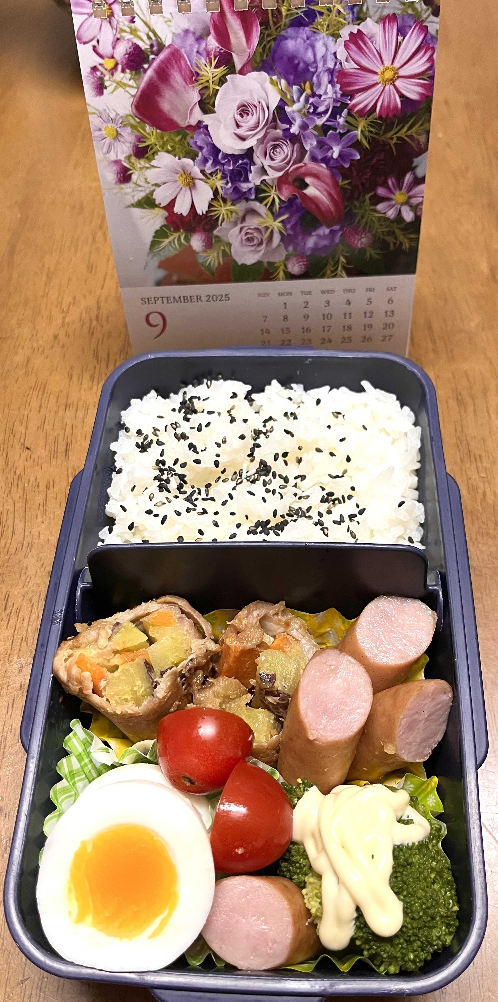 9月22日(月)。🍀冷やし中華弁当。りん、テスト1日目。午前中で学校終わる。そのあとお友達とラーメン食べて帰るんだって。なので、これは母ちゃん弁当。9月24日(水)。🍀チーズハンバーグ弁当。9月25日(木)。🍀チャーハン弁当。9月26日(金)。🍀バターしょうゆ焼きうどん弁当。9月27日(土)。🍀おにぎり弁当。共通テスト模擬試験、1日目。りん、頑張れ👍。9月28日(日)。🍀卵サンドイッチ弁当。ホットクックで内鍋でゆで卵、蒸しトレイで冷凍パン解凍蒸し。すっごいふかふかサンドイッチになりました💕。自然解凍とか、トーストとかより全然美味しいパンになりました💕。今週もパン作り🍞。自分の持っている型と、作りたいサイズ、量に計算して作る事にはまってます😊。🌸カスタードクリームちぎりパン。カスタードクリームは全卵レシピで作りました。発酵前。 発酵後。焼き上がり〜。ちぎって食べる食べやすい量になりました😊。🌸香ばしオニオンベーコンパン。このパンも何回も作ってるけど、自分の持ってるパウンド型のサイズ量に計算し直しして初めて作るパン。型のサイズ感確かめたかった👍。発酵前。発酵後。焼き上がり〜。このパンはお惣菜パンじゃなくて、おかずと一緒にいただくパンです😋。香りがいい。🌸クリーム、チョコクリームちぎりパン。カスタードクリーム、チョコクリーム、ホットクックですぐに出来ちゃいます。発酵前。 発酵後。焼き上がり〜。焼いたらクリームとチョコの色の変化なくなっちゃった😱。毎日パンのレシピ読んだり、YouTube見たり、まだまだ自分サイズレシピ未完成だからもっと作りたい😋💕。そして、さつまいも🍠の季節です💕。畑の今年お初のさつまいも🍠💦。何この大きさ〜😱(笑)。切るのも大変😢。スイートポテトケーキ。ホットクックで。YouTubeゆかり先生レシピ参考に💕。シンプルケーキ、冷やすと美味しくなりました💕。