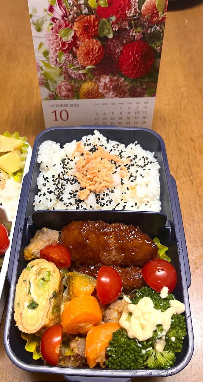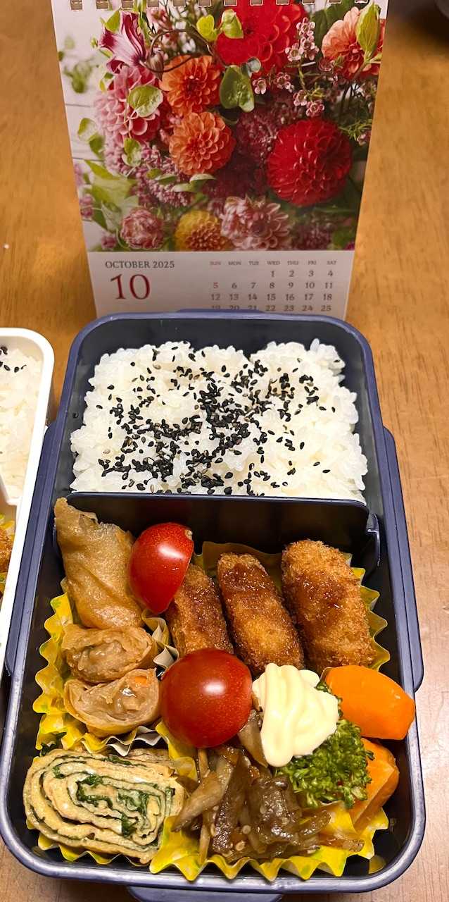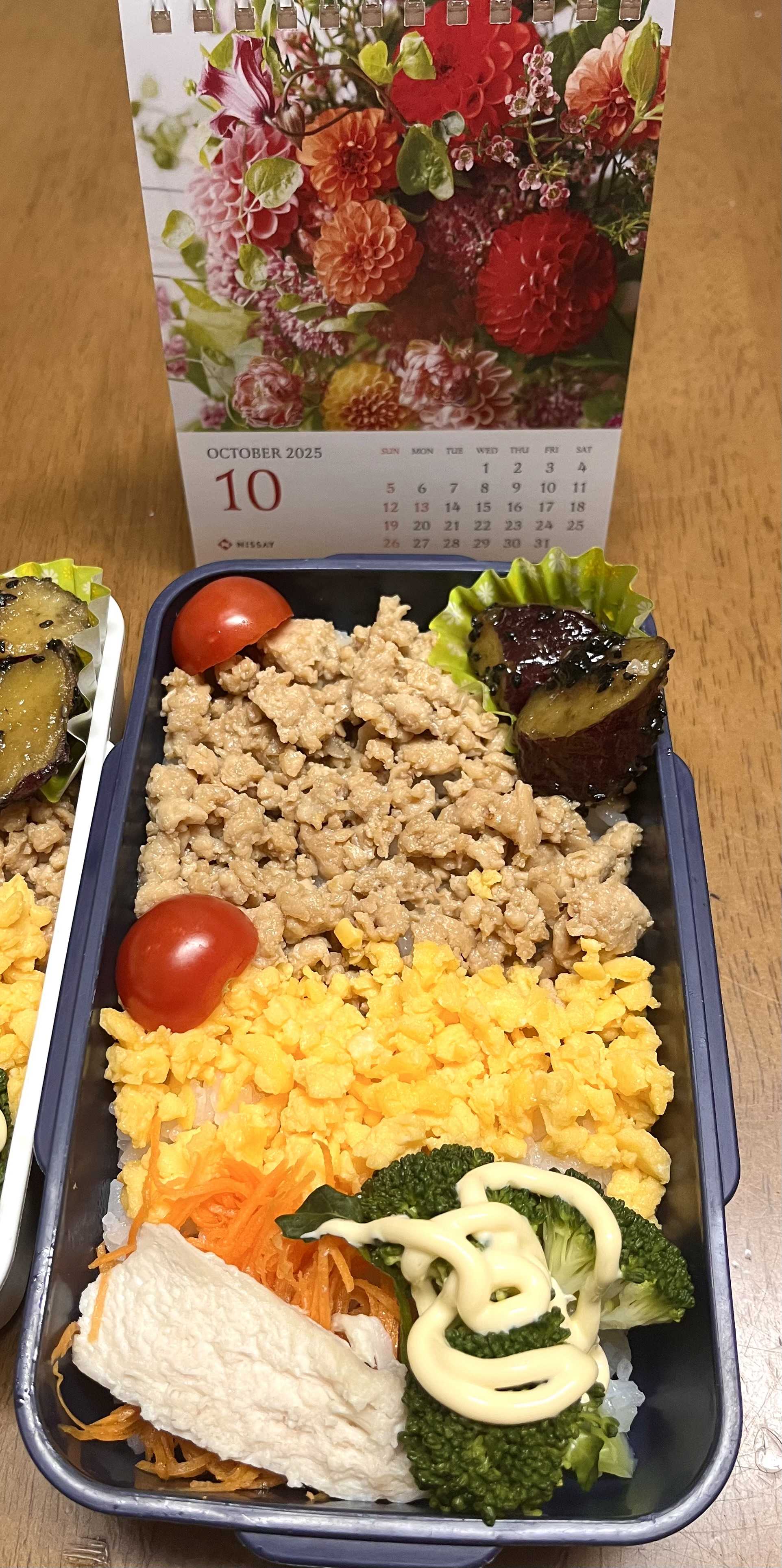 10月6日(月)。🍀2色➕αそぼろ弁当。この日は中秋の名月🌕💕。あいにく、青森の空にはお月様見えませんでした😢。ここ数年恒例の満月🌕デジカメ写真、今年は撮れず😅。10月7日(火)。🍀焼肉弁当。とにかく野菜たっぷりを意識します👍。食べたもので体ができている‼️。をりんに伝えてます。いずれ、母ちゃんの元巣立って行くからね😭。10月8日(水)。🍀おにぎり唐揚げ弁当。この日は高校最後の運動会💕。外仕様の好きなもの弁当作ったんだけど…。保護者も見にきて🆗の運動会。私にとっては子育て最後の運動会。私はしっかり有給休暇もらって朝から観覧する気満々。だが…、りん、前の日から体調不良😭。朝、発熱🥵。最後の運動会、欠席になっちゃいました😢。りんがいなくても、母ちゃん、見に行って来ました👍。りんのクラスの動画撮ったり、子供達の様子をりんと重ねて見て来ました。高校生、みんなかわいい😍。10月9日(木)。目玉焼きチャーハン弁当。りん、回復して学校に行きました👍。10月10日(金)。🍀エビカツ弁当。今週のランチ。(水)のランチだよ。🌸ビックマック風トーストサンド。最近、私のモードは冷凍保存レシピ検索。このマック風のサンドも、見つけた冷凍レシピなんだけど、これはリピートなし…。ハンバーグタイプのフィリングだと、焼くのに時間かかりすぎ😱。じいちゃん達のランチ時間に間に合いませんでした😭。同じ材料でひき肉炒めタイプレシピの方をリピにします。インスタレシピでいいなぁ、って思ったけど私的にはボツ🥵。でも、味はめっちゃ美味しかったよ😍。そしてさつまいも🍠の季節。いよいよあのどデカいさつまいも、着手しました👍。ホットクックスイートポテト、既に2回作ったけど、すぐに完食〜。写真も撮り忘れ😅💦。とても簡単に出来ちゃいます💕。そしてかぼちゃ🎃の季節でもあります💕。いも🍠、くり🌰、かぼちゃ🎃、りんも私も大好きです💕。畑のかぼちゃ🎃。ホットクックでとりあえず丸ごと茹でモードしてみました👍。これ、どうしようかな😅💦。候補は、グラタン、肉詰め、プリン、チーズフォンデュ、他に何かあるか、リサーチ中。