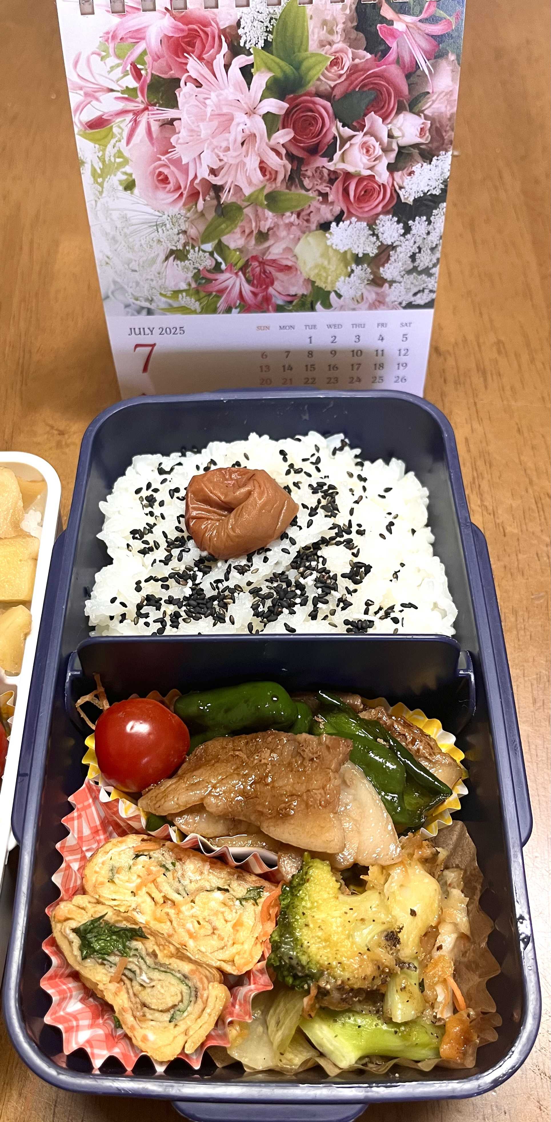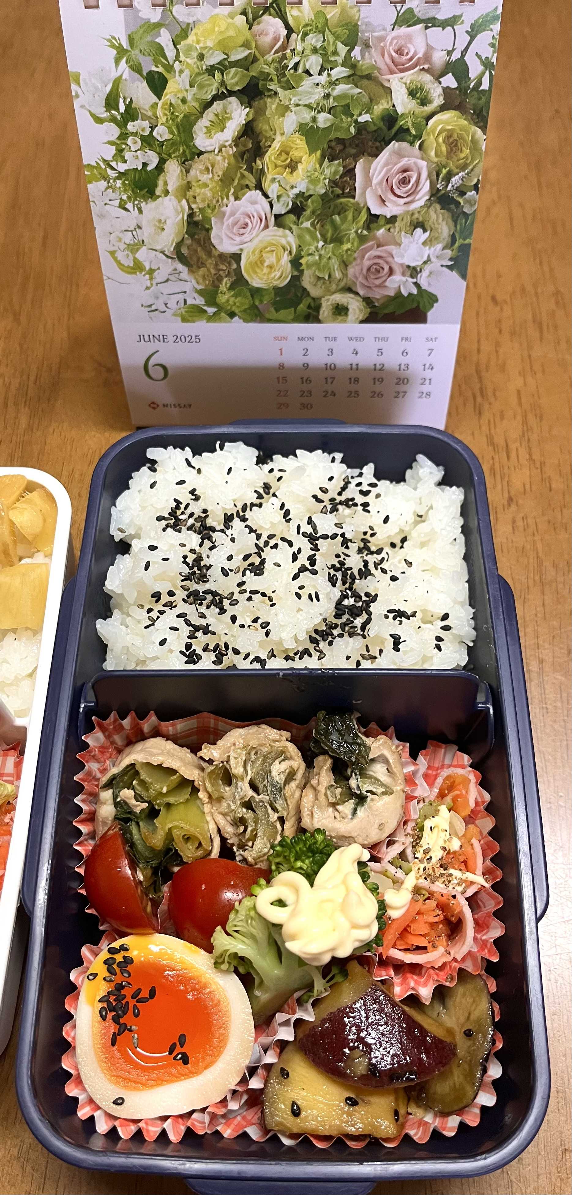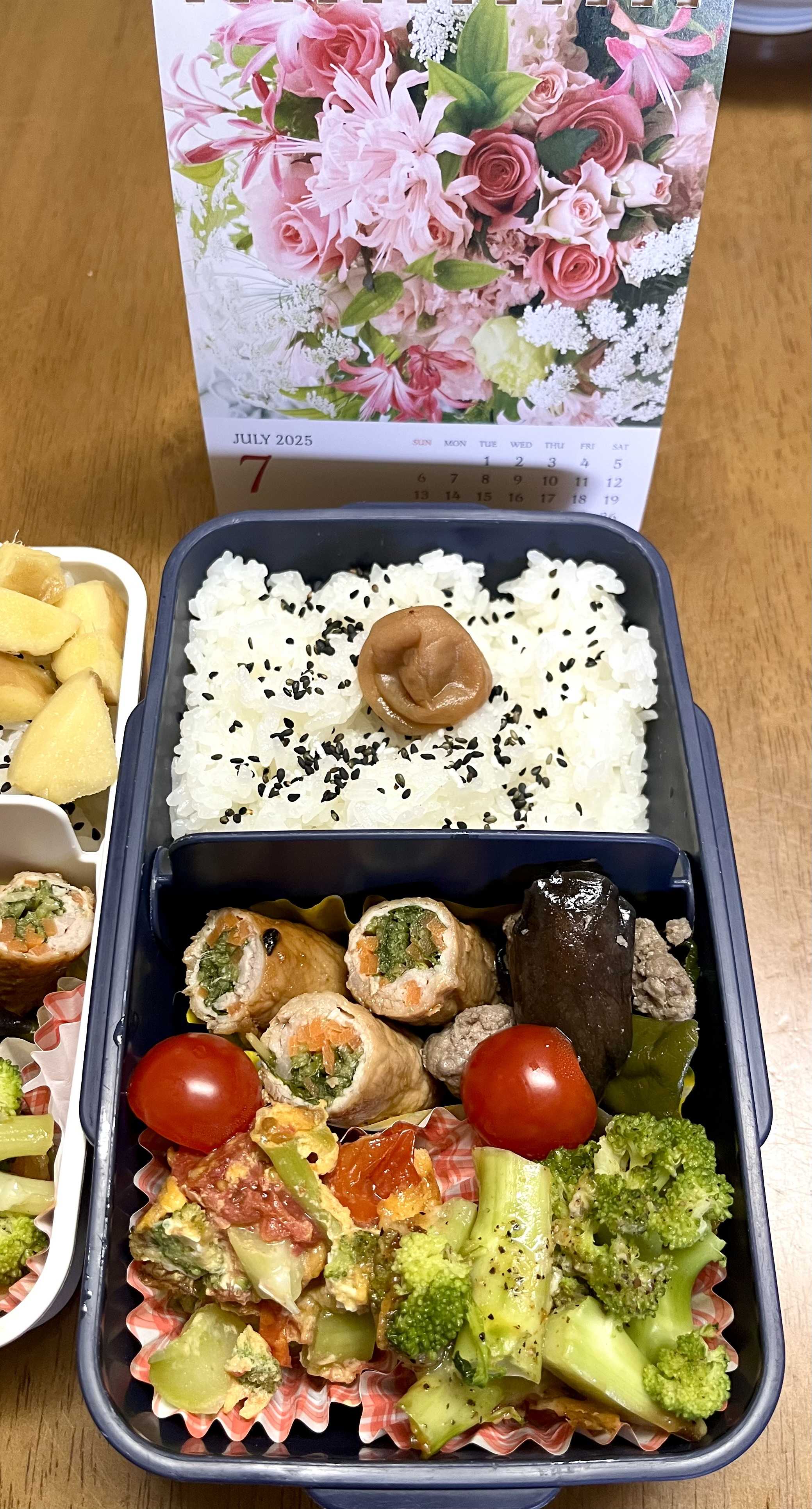 6月30日(月)。🍀トマトチーズハンバーグ弁当。前の日にホットクックで作ったハンバーグ。前まではこのくらいの量、みんなで普通に完食したけど、最近はじいちゃん、ばあちゃん食が細くなって、余っちゃうんだよね😓。余りはお弁当のメインになります👍。7月1日(火)。🍀鶏むね醤油麹焼き弁当。カレンダー、まだ6月‥😱💦。あまりにも時がたつのが速すぎて、変えるの忘れ😱。7月入ったって感じしない😅。7月2日(水)。🍀チャーハン目玉焼き弁当。困った時の目玉焼き弁当です😅。前の日何にも準備しないで寝ちゃった😓。7月から私の勤務体制ちょっと変化。残業組になり、帰宅時間遅くなってます😅。体力、気力きちんと向き合いながら無理ない範囲で頑張ります👍。7月3日(木)。🍀にんじんアスパラ肉巻き照り焼き弁当。野菜肉巻きはホットクックお得意です💕。7月4日(金)。🍀回鍋肉丼弁当。7月から勤務体制変化ありで、会社のみんな手探り状態。私は変化あっても楽しく仕事できているから、ま、いいか。今週のせいろ料理。私の朝ご飯。18センチせいろ、2段使って1人分。温野菜、蒸し卵。食パンふかふかです。甘麹ヨーグルトははずっと続いている習慣。ご飯、かぼちゃ、さつまいも、ブルーベリー、バナナ、ココア、りんご、レモン、きなこ、黒ゴマ等々いろいろ作りました。今回はブルーベリー麹です。麹も高くなったけど、これは続けたい習慣です👌。今週のランチ。🌸ホットクック冷やし中華。暑すぎるので、ガス使わないで作りました。蒸し麺は焼きそば麺をホットクックで蒸して、薄焼き卵は電子レンジで。肉まんも蒸し麺と一緒にホットクック蒸し。畑の野菜達。私は全くノータッチ。全部じいちゃんがやってます😅。一緒にやればいいんだろうけど‥。ネギ。 赤紫蘇。ジャガイモ🥔。 枝豆🫛。かぼちゃ🎃。 きゅうり🥒。トマト🍅。千葉の親戚からびわ頂いたんだけど‥。食べ慣れないから味も食感も私はイマイチ😢。コンポートにしてみました。ホットクックで。お庭に赤紫蘇。毎年恒例の紫蘇ドリンク作ります。ゆかり先生レシピをホットクックver.にアレンジ。今週の作り置き。これがあると安心だけど、暑くて傷みやすいので、最小限に。びわのコンポート、成功です💕。赤紫蘇ドリンクも、夏バテ防止に毎日飲みます。せいろ料理。せいろ蒸し料理、シンプルで美味しい😋。ホットクックで10分蒸し。ホットクック、ますます大好きになりました💕。