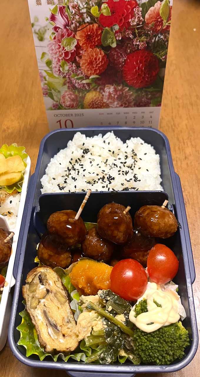10月14日(火)。🍀ミートボール弁当。休みの次の日は手抜き弁当。レトルトミートボール、前の日の残り弁当。作ったのは卵焼きのみ💦。10月15日(水)。🍀春巻き&ささみブロッコリーチーズ焼き弁当。10月16日(木)。🍀いもにんじん肉巻き照り焼き弁当。10月17日(金)🍀唐揚げケチャップ弁当。おかずストックなくなってきて、困った時のちくわチーズ巻き。青じそがあって良かった〜😊。10月18日(土)。🍀オムライス弁当。りん、模擬試験。私とりん先日、りんの進路の事で夜寝る前に親子会議(良く言えば。)。現実は…、親子バトル💢🥵。りん、夢ばかり見てないでそろそろ現実把握してくれ😱。丸ごとかぼちゃ🎃。かぼちゃ丸ごとハンバーグ、作ってみました。いつものハンバーグのタネをかぼちゃに詰め込み、ホットクック、『かぼちゃの肉詰め』キーで、スタート💕。出来上がり〜。🌸かぼちゃ丸ごとハンバーグ。ホクホク、肉汁ジューシーで美味しく出来ました💕。うちはこの量だと余るので、翌日、マッシュして、かぼちゃコロッケにアレンジ。アレンジがきくこういう料理、私は大好きです💕。🌸さつまいもポタージュ。材料入れれば、あとはホットクックが作ってくれます💕。先週のいつぞやのランチ。さつまいもの皮も無駄なく、細かく切って、レンジでチン。トッピングにしました。🌸ホットクック&ガスオーブンで干し芋。干し芋、大好きなんだよね。食べ過ぎ注意⚠️。デニッシュ風、あんぱん。発酵前。 発酵後。焼き上がり〜。🌸パウンド型であんデニッシュ風食パン。バターの風味、ほんのり。少しサクサク。デニッシュ風ですからね〜。でも、量もちょうど良く、美味しく頂きました😋。🌸先週のいつぞやのパンランチ。カスタードクリーム、余っていたので〜。カスタードクリーム、チョコフィリングです。発酵前。 発酵後。焼き上がり〜。🌸ブリオッシュスイス。甘ーいお菓子パン。甘いパン作る時は、パン粉ね器最低粉量、200gで作ります。作るのにちょうど良い😋。👍最近のマイブーム。冷凍食品ストック作り。具沢山、高タンパクおにぎり作るのにはまってます。お米生活に切り替え中。畑の大根菜、小松菜を細かく炒めて小分け冷凍。ご飯にいろいろ具材を混ぜて、栄養満点にして、冷凍保存。あすけんでチェック✅。バランス良く食べて、ダイエット頑張ります👍。
