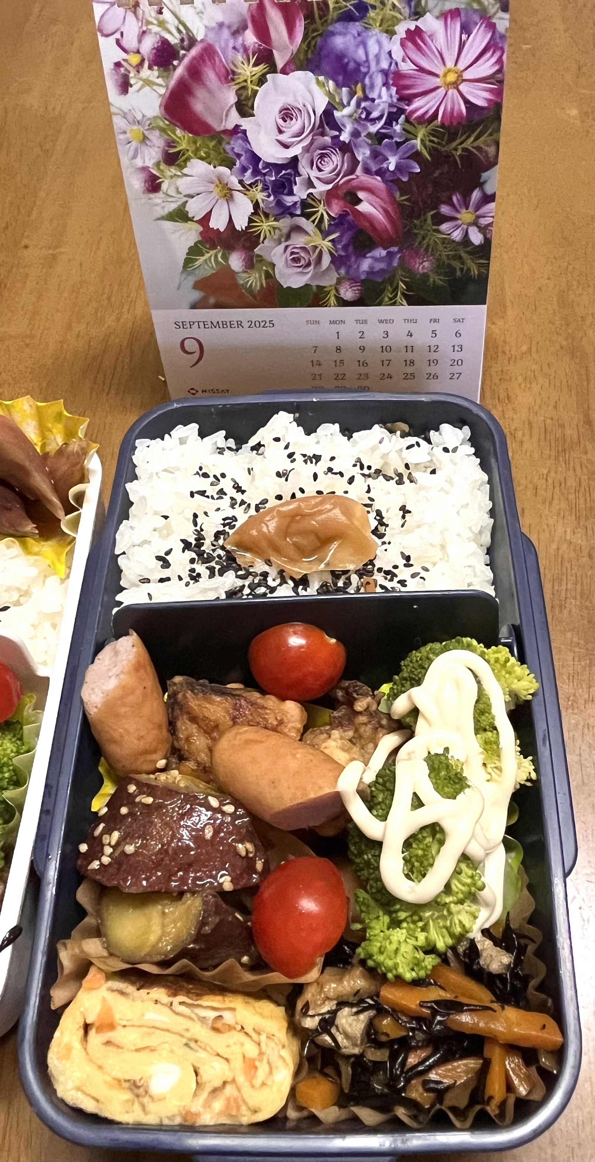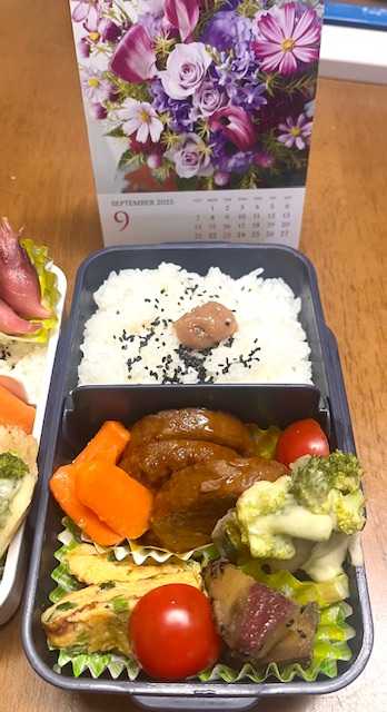 9月1日(月)。🍀マルシンハンバーグ弁当。9月2日(火)。🍀白身魚フライ弁当。この日‥。直前になってわかったこと。芸術鑑賞で各自、外食ご飯。知らない私は朝フツーにお弁当用意。りん、『今日、弁当なしなんだよね。言ってなかった?』って。私、『聞いてないよ〜。』。しかも弁当バックりん持って車に乗ってるし。私、『置いてくれば良かったでしょ💢。 じいちゃんとか食べるし。』結果、この日のお弁当ばムダになりました‥。私、食べ物ムダにするの大っ嫌いなんだよね‼️。9月3日(水)。🍀唐揚げ甘酢漬け弁当。9月4日(木)。🍀チャーハン目玉焼き弁当。9月5日(金)。🍀ソース焼きそば弁当。今週のランチ。いつものホットクック💕。🌸トマトナスベーコンパスタ。🌸ホットクック醤油ラーメン。今週のスイーツはなし。なんだか作る時間ありませんでした😢💦。私の体型改善実施🖐️。お盆から毎日ステッパー踏むようにしてます。体型、体重、マックスに大きくなっちゃって😭。このままじゃいけない😓。ステッパー、買って1年以上たつけど、三日坊主で続かない🥲。他の運動器具もしかり😱、(私、運動器具アイテムだけはかなりあり😱。)とにかく私の1番の敵は、『継続すること。』これが中々手強い。続ける‥。続けることができたらこんなに悩まないのに😭。①ステッパーのハードル下げて、『とにかく毎日5分だけは必ず踏む‼️。』 これが意外に良い‼️。 5分ってあっという間。 もっと踏みたくても、一度終了。 それでも踏みたい時は5分スパンで継続。②大好きなビールは週末のみ。 ビールの買い置きしない。 週末は心置きなく飲んで🆗。③目標は以前着ていたスーツを着れるようになる‼️。 これほんとに私着て仕事してたの😱⁉️。 っていうくらい入らない。 仕事変わってスーツ着る訳じゃないけど、 自分の目安です👍。こんな感じでゆる〜く、ダイエット開始です🖐️。私のあすけんグラフ。緑の線ラインは体重。棒グラフは運動量。体重もすこーしずつ変化あるかな⁉️、9月6日のグラフの突出は、久しぶりにプールに行ってきました〜。がんばろ。