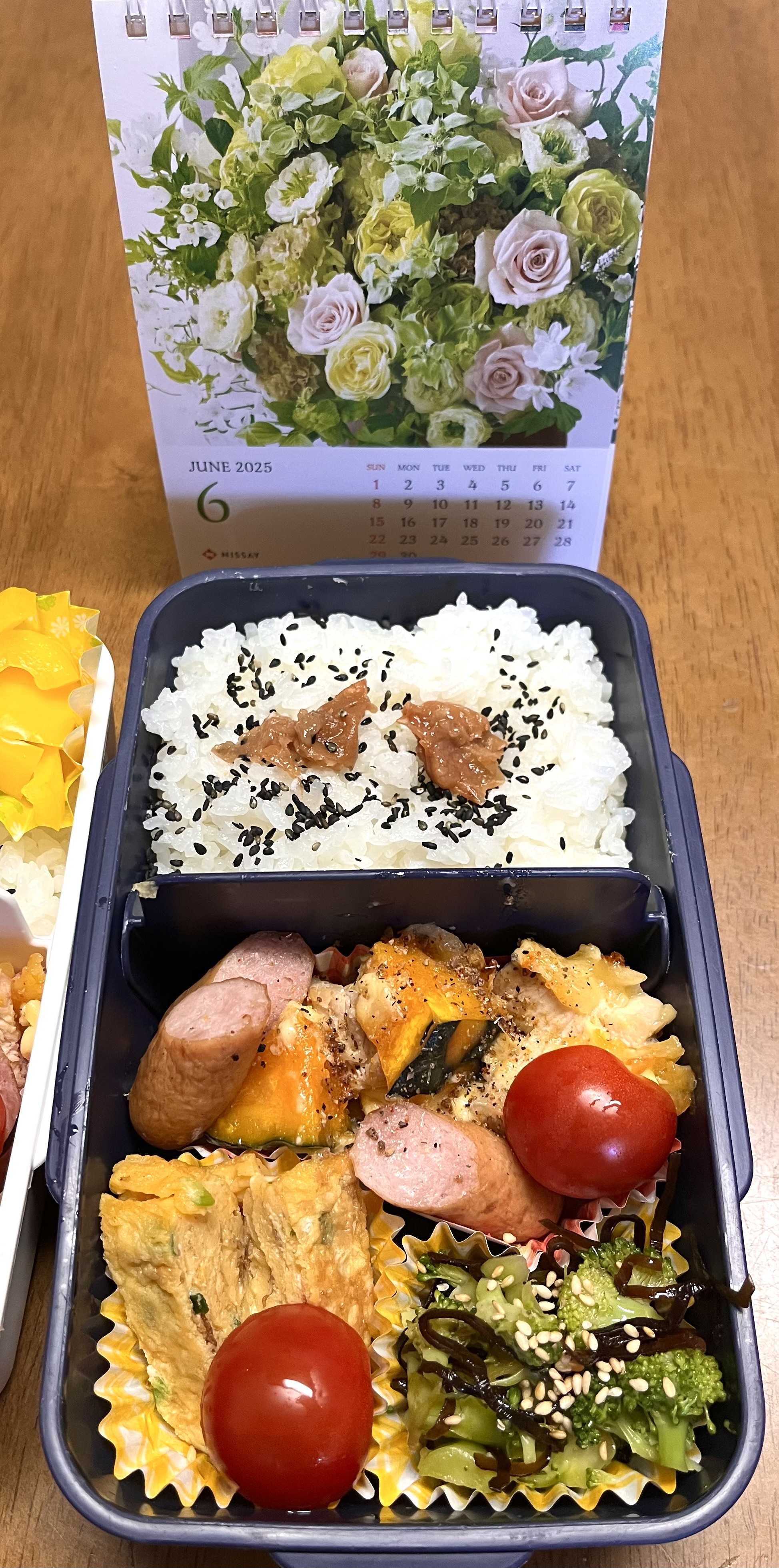 6月16日(月)。🍀鶏の照り焼き&卵焼き弁当。6月17日(火)。🍀イカリングフライ&むね肉南蛮漬け弁当。6月18日(水)。🍀鶏もも塩麹唐揚げゴマまぶし弁当。6月19日(木)。🍀目玉焼きチャーハン弁当。6月20日(金)。🍀オムライス弁当。週末は夏の準備しました。🏝️エアコンそうじ&確認。(エアコンクリーニングって今時期しかできない😱。)🏝️りんの冬もの洗濯&衣替え。(未だ自分でやらない😓💦。)🏝️クリーニング出し。(毎年高くなる😓‥。)🏝️お布団カバー&シーツひんやりに替え。(ニトリのひんやりシーツ、そろそろ新調したい🥲)今週のランチ💕。🌸ホットクックジャージャー麺。🌸ホットクック無水ボロネーゼ風パスタ。前日のジャージャー麺アレンジ料理です💕、トマト缶、塩麹プラスしてパスタ作りました。今週の蒸し料理💕。ホットクックモーニングプレートに。🌸ワンプレートモーニング。皿にのらなくて、ワンプレートじゃないけど💦。手作りいちごジャム、瓶いっぱいに頂きました💕。冷凍食パン蒸すとふわふわもっちり。ジャムもパンもめっちゃ美味しい😋。ホットクックだとせいろいらずで🆗。でも、先日買った18センチせいろ、なんとか使いたくて‥。2段ホットクック仕様で作ってみました😋。キャベツの巣ごもり卵、蒸しトースト、いちごジャム。内鍋にわかめスープ。今週のスイーツ💕。🌸みかん牛乳かん。ホットクックで作ってみたくて😃。ホットクック用にレシピ改良。大成功👌。妹んちにあった本、私も買っちゃった👌。ちょっと見せてもらったら、私、気になってしょうがない😱。Amazon、中古で100円でした。送料、350円。3.5倍(笑)。でも全然お品は良かったよ。パン作りたいんだけど、いきなり夏室温になってしまって、この暑さの中、パン粉ねとかガスオーブンやる勇気なし😓。キッチン、ボワボワ暑くなるんだよ😱🥵なんかいきなり夏になってしまった感じ😓。6月でこんなだと青森も大変💦。でも、まだ扇風機でしのげるからまだいいのか😁。