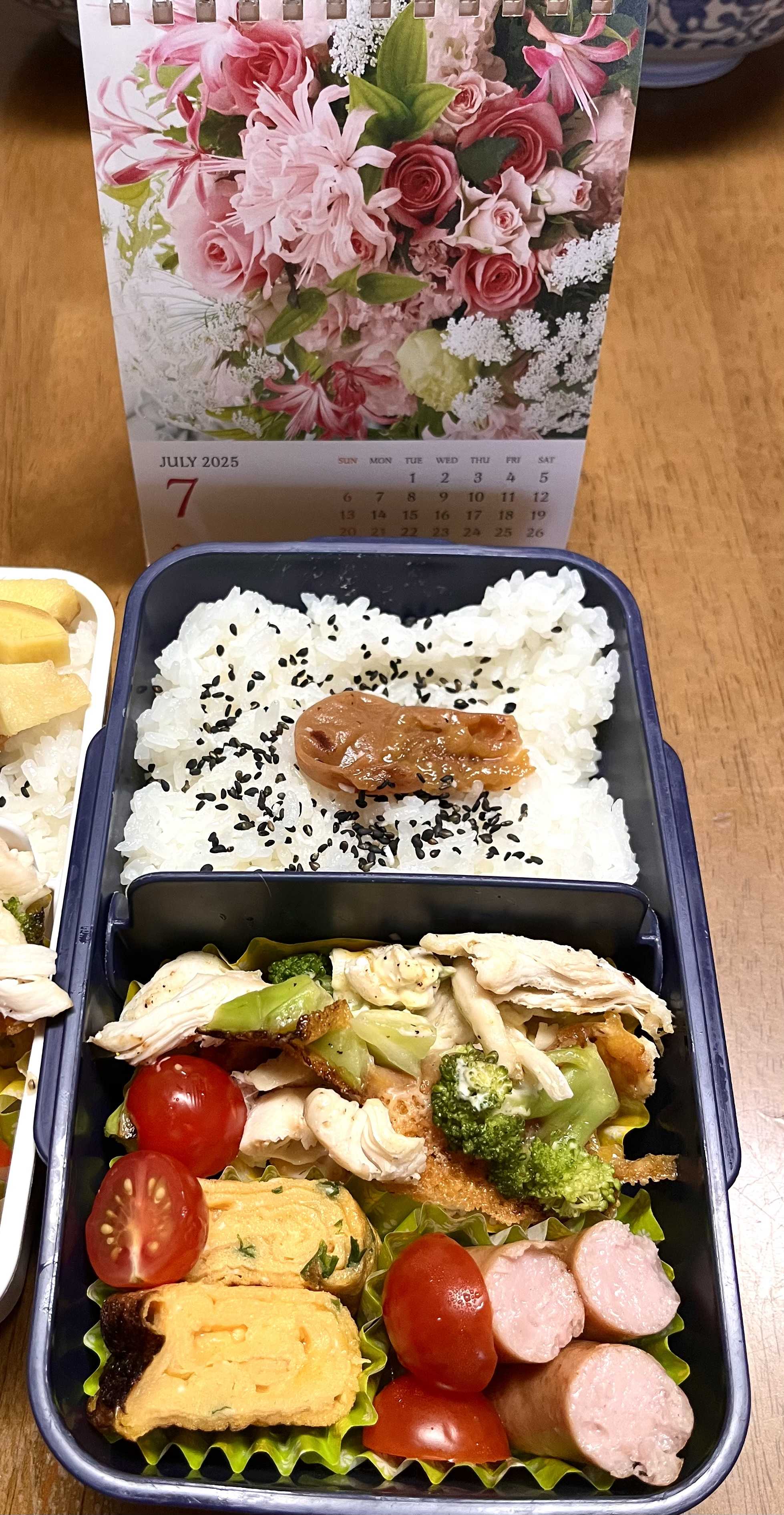 7月28日(月)。🍀サラダチキンチーズ焼き弁当。7月29日(火)。🍀エビハンバーグ弁当。7月30日(水)。🍀照り焼きハンバーグ弁当。午前中の仕事中、TVのニュースかかってて。津波警報🚨。あー😱、陸奥湾も注意報出てるし😱💦。りんの高校は海が激近💦。夏期講習中断して垂直避難したみたい。7月31日(木)。🍀目玉焼きチャーハン弁当。夏期講習休み。家にいてもはかどらないから、図書館に行ってこようかな。って言ってたし、りん、駅の図書館で勉強して来た様子。私、昼に確認済み。でも私の帰宅時間(8時半頃)になっても何にも連絡ない。自転車で行ったきり、まだ帰ってないよ。とばあちゃんからの連絡。どういうこと〜⁉️。ライン既読にならず。ライン電話、音信不通。連絡手段が簡単にあるこの時代、全く連絡なし、既読にならない。っていうのが30分でもあると心配で心配で😭。いてもたってもいられなくなります😭。9時くらいに、ひょっこり帰宅。私、すごい剣幕でまくしたてました。心配するでしょ💢💢。あー、気づいたら充電切れちゃって。そんなに心配すること〜⁉️だって😓。心配症の親心‥。自分、子離れできるのか‥。8月1日(金)。🍀オムライス弁当。りん、大好きなオムライスです。模擬試験1日目。8月2日(土)。🍀おにぎり弁当。模擬試験2日目。毎日暑くて🥵。とにかく食べて、睡眠💤取らないと夏バテしちゃいます😱💦。土用の丑の日の。🌸うな牛丼。うなぎはお取り寄せ。牛丼はホットクックで作りました😊。週末ランチ。🌸坦々混ぜ麺。ゴマだれかけて混ぜて食べます。写真、ゴマだれ、かかってない😱。スイーツはなし。暑くて作る気力も無し。早く30度以下にならないかなぁ。30度越え、毎日って、数年前は青森なかったのに〜😱💦。