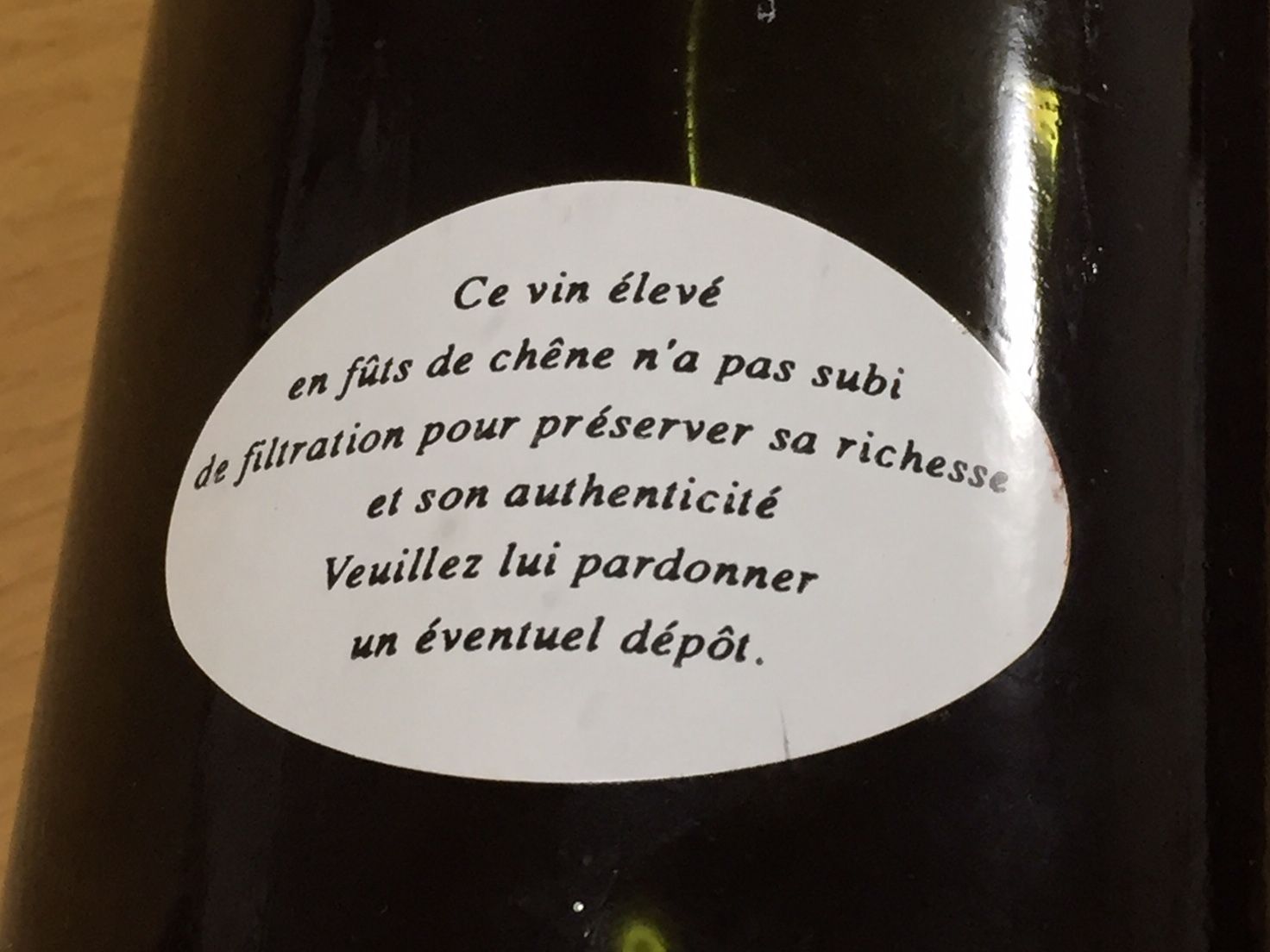 ボトルの裏には、このワインはフィルターを掛けていないよ、という内容の注意書きが貼られている。ジャイエより情報量が多くて面白い。最後のdépôtは「沈殿物」、つまりおりのこと。こういう注意書きのシールの貼られているワインは、最近あまり見ない気がする。