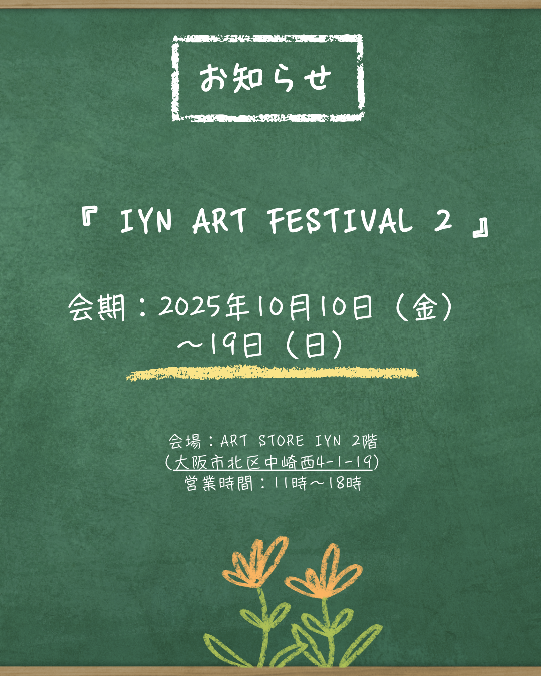 IYN ART FESTIVAL 2◇会期◇ 2025年10月10日(金)~10月19日(日)営業時間 午前11時〜午後18時◇会場◇ART STORE IYN 2階 〒530-0015大阪市北区中崎西4-1-19◇ーーーーーーーーーーーーーーーーーーーーーーーーーーーーーー◇ART STORE IYNの企画展『IYN ART FESTIVAL 2』に出展します!新作2点(水墨画、クレヨンアート)と、過去に描いた"お気に入りの指感アート"1点を出展します。お近くに寄られた際に是非とも会場でご覧頂けましたら幸いです。戸阿紀(ToAki)*:・★・:*★*:・★・:*★*:・★・:*※アメブロのほうは毎日更新中です※にほんブログ村旧メインブログ『しょこらのオレンジすくえあ』内の☆しょこらの「書ぎゃらりー」☆では、「書道作品(課題もの・オリジナル作品)」を展示しておりますので、課題作品や過去の作品を見てみたい方は是非、見てやってください。m(_"_)m