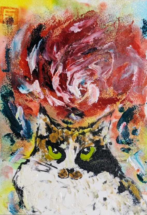 本日、2本目の更新です。★一本目の記事★続いて紹介する作品はこちらです。『ぱっしょにずむ』(2024・12)この作品も「ポストカード展 Vol.2」に出展した作品です。先に猫を墨で描き、周りをアルコールインクアートみたくしようとしたのですが、和紙はがき…ということを忘れており、見事に紙にインクが吸い込まれインクアート失敗。焦った私はなんとなく…猫の色付けをした後にぐりぐり~っと周りを指で描きました。テーマは「パッション」。熱すぎる?情熱を表現しました。指感アートは「情熱の炎」が燃えたぎっています。゜.+ε(・ω・`*)з゜+.゜ε(・ω・`*)з゜+.゜ε(・ω・`*)з゜+.゜令和5年度 与謝野町文化祭(展示部門)の様子令和6年度 与謝野町文化祭(展示部門)の様子゜.+ε(・ω・`*)з゜+.゜ε(・ω・`*)з゜+.゜ε(・ω・`*)з゜+.゜*:・☆・:*。皆さんに「素適にHappy!」が訪れますように。*:・☆・:**:・★・:*★*:・★・:*★*:・★・:*私の旧メインブログ『しょこらのオレンジすくえあ』内の☆しょこらの「書ぎゃらりー」☆では、「書道作品(課題もの・オリジナル作品)」を展示しておりますので、課題作品や過去の作品を見てみたい方は是非、見てやってください。m(_"_)mにほんブログ村