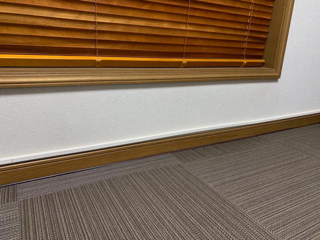 床のへりに HDMI ケーブルをはわすため、タイルカーペットを 1cm 短くしてます。