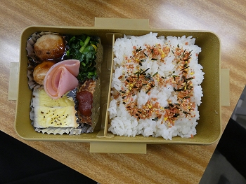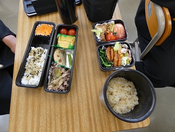 女子はなかなか見せてくれないそうで,これらは全部男子の,ご家庭の愛情のこもったお弁当です。これを食べて,力が発揮できなかったら「罰が当たる」!