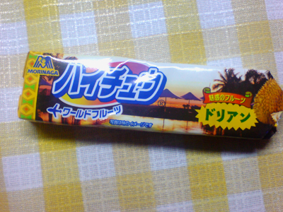 こんばんは。まずはここ数年この時期毎年書いていることですが…祝!巨人リーグ優勝!!V3じゃぁ~!!いやぁ~、めでたい!ホントによかったよかった。ま、この話はこの辺に致しまして…本日職場で弐条さんにこんなものを頂きました。ハイチュウ【ドリアン】!!凄いですね~、ドリアンですよ、ドリアン!!キングオブフルーツ!!以前にも会社の女の子が買ってきて食べた事があるのですが…非常にマズイ!カナリ強烈!私は本物のドリアンを食べた事ないのでハッキリわからないのですが、多分高い確率で本物に近いと思われます。せっかく頂いてこういう書き方も何ですが、ホントに森永はやる気があるのだろうか?これにOKを出す時点でかなりの脅威でございます。