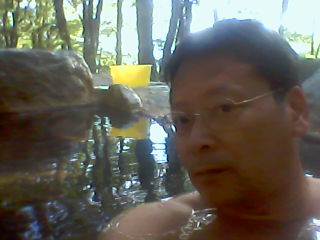 今、露天風呂。あとは刺身とビールでテント宴会。