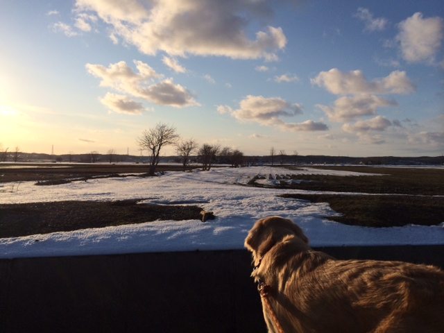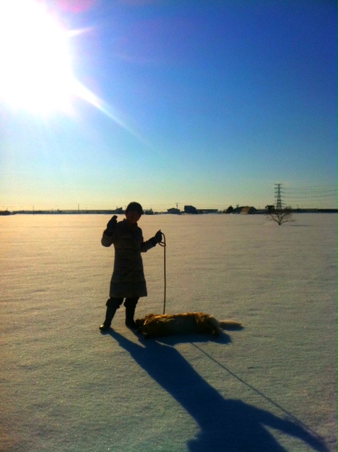 自然の仕組みはおもしろい、先日、雪ではなく雨が降った。が、しかし、夜はけっこう冷えたのです。となると、積もっている雪の表面が一旦解けて、そして夜中から明け方に凍ったのです。 その結果。家の裏の農地に積もりに積もった雪の平原を歩くことができるのです。ってことで。。。ココちゃんとアサンポ。。。途中から次男君も呼んでのアサンポ。。。 とお~~~くにみえるのが家。。。片道2キロ位かな~ 農家の人たちは、この時期にタイミングを見て融雪剤をまくのですが、兎に角、3メートルちかく積もっている雪を溶かさないといけないのでね!その合間の1日か2日しかない貴重な氷の平原なんです。 おまけに天気が最高で、寒いんだけど暖っかいのです。歩きましたね~夏は、途中に閾があったり溝やちょっとした川もあって、まっすぐは歩けないし、なにしろ農地なんで、作物を跨いではいけないし。。。。 こんな日は、お弁当もって半日くらいウロウロしたいもんですよ。でも、ウロウロしてたら、農家の人に怪しがられるとおもうけど。っていう貴重な体験をして楽しかったです~~ ココもたくさん歩けてよかったかな~おなか減ったのかな~ あんのじょう今日見たら黒い融雪剤がまかっれてました。これから春に向けて一挙に溶かしていくんですね! にほんブログ村