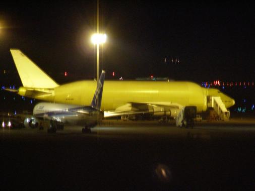 こんな大型飛行機が来ているとニュースで見て、行ってきました 何でも飛行機の部品・・翼とか?・・を運ぶ飛行機だと言ってました。明日には飛んで行ってしまうとのことなので、今日は仕事で美濃加茂へ行っていたのですが、名古屋を横切って空港まで おもしろい形をしていますよね。中部空港の入り口には、宝船がありました。 「なぞの旅人フー」も乗っているけど、お正月もそろそろお仕舞いだから、もうじきこれもなくなるかな。空港は空いていました。お正月と3連休が終わって、旅も一段落でしょうか。※この飛行機は、米ボーイング社の新型旅客機の胴体や翼を運ぶ特殊貨物機「ドリームリフター(747LCF)」というのだそうです。機体後部がパカッと割れて、荷物を積み込みます。12日の朝、初荷の胴体と翼を乗せてシアトルに向けて飛び立ったそうです。正式塗装が前の姿は、なかなか見られないもののようですよ。