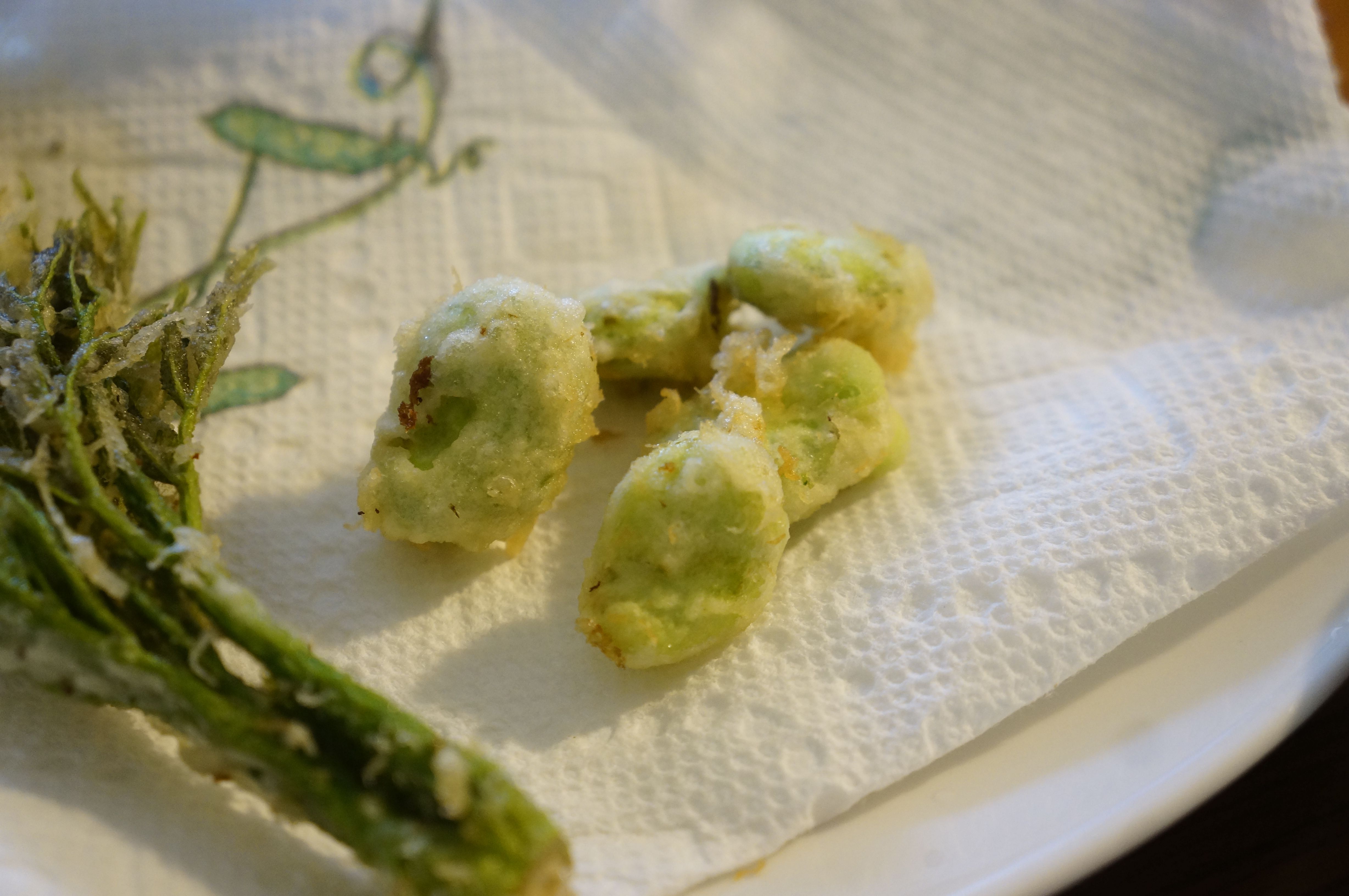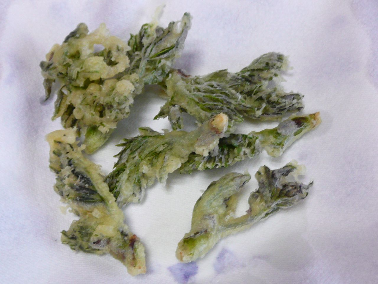 次に山菜を綺麗に洗って、さっと水分をふき取り、これらに小麦粉をまぶし、余分な粉を払い落としてから衣をくぐらせ油の中へ入れます。たらの芽は、頭の中で20秒数えて箸でひっくり返しさらに20秒、こしあぶらは15秒の15秒数えて油から引き揚げます。
