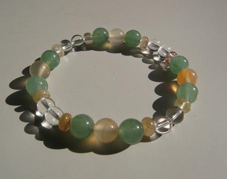 里帰りした時に、以前話題に出したアベンチュリンと一緒にブレスにする石を探してきました。 どんなのにしよう?と散々悩んだ挙句、結局、ウダウダ考えるより直感で選ぼう。と言う事にして、選んだのがカーネリアン(色薄め)、ルチルクォーツ、水晶の三種類でした。この時は本当に何も考えず直感で選んでいたのだけど、後になって考えてみればカーネリアンは第二チャクラを活性化するパワーストーンだったのですねで、こちらに戻ってきてから作ってみました 初ブレスですいざ作る段階になると、このこたち、わっかにして繋げて仲良くやってくれるかしら?とか考えちゃったりして。こういうとき、石と仲良しだといいですね。さて、このブレスのテーマは何かしら?なんて考えながら大天使オラクルカードを引いたら出てきたカードは Prosperity (繁栄)とにかくカードの色身がブレスにそっくりだったので(笑)これだ!と。勝手に決めちゃいました。 さて、ほぼ毎日のように腕にはめているブレス、「守護天使」ちゃん。プロフィール画像にもでている、本当に大変お世話になっているブレスレットです。前回のお里帰りメンテナンスからほぼ1年経ってしまっていたので、あわててKey Treeさんにメールしました。それが初ブレスを作った翌日の事。メールを送った2~3時間後、たまたま様子見で繁栄ブレスちゃんと重ねて腕につけていました。台所仕事をするため腕からはずそうとしたその時、守護天使ちゃんのゴムがぷっつり切れてしまいました。ブレスのゴムが切れるって結構ショックですねあわてて石を拾い集めて点呼しました お里帰りが決定したのでホッとして切れたとか?繁栄ブレスちゃんと石の相性があわなかったとか?いろいろよぎりましたが、何はともあれ私の里帰り中に外で切れないでいてくれた事に感謝守護天使ちゃんは今日、お里帰りの旅に出かけましたよ