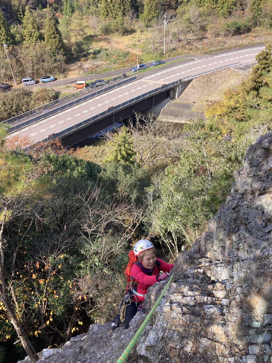 11月23日日曜日。またしても早朝出発して東京駅発7時02分のひかりに乗って一路名古屋へ。名古屋からガイドの車で岐阜県美濃加茂市にある里山・高木山へ向かった。これが中々遠くて途中、犬山市を通過して更に田舎に入っていき、およそ2時間は要した。高木山はクライミング専門誌ロック&スノウで旧知の松原尚之ガイドによって紹介された「里山でアルパインクライミング」で最近知られるようになった地方の岩場である。彼のタイトルでは「より高くなく より困難でもない岩稜」高木山南稜とある。関東地方のマルチはあらかた経験してしまったので「知らない場所を訪ねてみたい、どこか遠くに行きたい」とばかりNガイドとともに初めて訪れたのだった。初日の今日はまず北尾根に昇る。草むらの中の駐車場から徒歩10分もかからない超便利な取り付きから開始。クライミングシューズは履くがチョーク不要という気楽なスタイルである。ほんと、岩のルートというよりほとんど岩稜なので斜度も低くスイスイと昇れてしまう。 手前 高木山南稜 奥 北尾根 眼下すぐに道路何の困難もなく昇れるのでグングン昇って先行者も追い抜いて快調に進んだ。小さなピークをいくつもいくつも超えて最後に終了点に到着した。標高400mにも満たないのだが山頂からの展望は抜群で穏やかな田園地帯の温かい風景が広がっていてとてもよかった。 そこからはせっかく来たのだから高木山をぐるりと一回りしようということになり、縦走路をたどった。落ち葉を踏み、オレンジ色の紅葉を見ながらのんびり歩いた。途中で愛宕神社もあり、そこが山頂のようだった。下山途中に770段の階段があり、驚いた。私たちは下りだからよいが、登ってくる皆さんは大変そうだった。下った地点がみのかも健康の森で紅葉が真っ赤で見事だった。 名物770段階段 みのかも健康の森 暑くてアンダー1枚になっている!!」こうして美濃加茂市の初日が穏やかに終わった。晴天でとても暖かく、無風、人も少なくて今回も恵まれた。