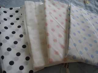 久しぶりに布を買いました。Fabric House Iseki定価1m980円の商品を、1mあたり333円の破格値です!メーカー協賛品の為、再販なしの限定セット...価格:2,000円(税込、送料別)Fabric House Isekiははじめてのお買物。メルマガ登録をしていて、お得な生地セットがよく売り出されて気になっていたショップです。届いた生地は色違いの4色。女の子は全色、男の子はピンクをのぞいて3色が使えそうな色です。黒の水玉は牛さんを想像してしまって、今のところ何に使おうか思いつかず。小物使いかな。生地は商品説明で想像していた通り薄い生地。透けます。子供の日焼け対策グッズを作るのに薄くて涼しいのがいいかなと思って選んだので、届いてその薄さを確認してバッチリ☆問題はチョロチョロする息子の邪魔に負けず、ミシンに向かう時間が作れるかってこと。夏が終わるまでに日焼け対策グッズがいくつ完成することやら。