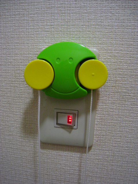 平日は私が1人で3歳の娘と5ヶ月の息子をお風呂に入れています。娘が「おしっこー」と言えるようになったのは嬉しいけど、お風呂中に言われるとかなり困る...一応、トイレに行って1人で一通りできるのですが、スイッチが届かなくて電気がつけられないのです。電気をつけっぱなしにしておけば「1人で行っておいでー」とも言えるのですが、消すのが習慣になってるから忘れちゃうんですよね。息子をタオルで巻いて床に寝かせ、私もタオルを体に巻き、娘の体を拭いてトイレへGo!寝返りを覚えた息子はコロコロ転がって裸でフンッフンッ手足を動かしてるし。。。これから寒い季節、どうしようかしらと悩んでいたところ。ママ友の家で見て「コレ便利!」と教えてもらいました。電気のスイッチに取り付けると、紐をひっぱって電気のON/OFFができるもの。はじめて見た時、めっちゃ感動したわー。”こどもスイッチ”って言うんです。うっかり商品名を聞くのを忘れたので、電気屋さんで探している時に店員さんに説明するのが大変でしたさっそく我が家のトイレにも取り付け。両面テープでピタリとつけているだけ。はがすときはキレイに取れると思います。我が家は賃貸だけど問題ナシ☆右の紐がON、左がOFFになっています。うちのトイレは暗いので昼間も電気が必須。お風呂の時だけでなく、昼間も1人で言ってくれるようになって大助かりです。