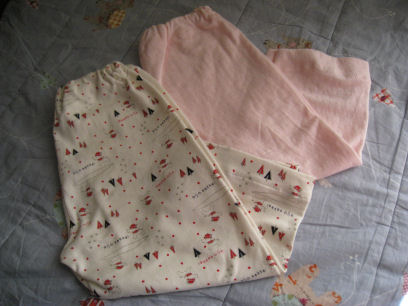 季節の変わり目で、どの服を着ようかな~と迷う毎日。娘ちゃんには、さらに困ってしまいます。だって、先シーズン着た服が全部小さくて...先シーズンどころか、春に着ていたものさえもサイズアウト!慌てて秋冬物の準備をしてます。まずはパジャマの長ズボン。上着は長袖の肌着があるからとりあえず後回し。寒くなっても寝相が悪いから、いつも布団からはみ出して寝てるからね。せめて着るもので温かくしないとね。来年も着られるようにSIZE100にしたら、ダボダボだったウェストはいい感じなんだけど裾がね...起きている間はロールアップして、寝たらそろ~っと足先まで伸ばすことにしました。つま先まですっぽり!足の冷えが防止でいていいかも縫い代は、おり伏せ縫いで始末。ちょっと面倒だけど、必ず来年も着ると思うから、丈夫に作っておこうと思いまして。パパさん要望の”バック目印”。これがないと、なぜかいつも前後逆にはかせてしまうんだよね。スタンプ:Stamp Love型紙・作り方