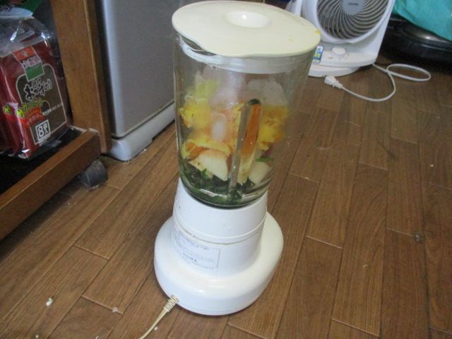「普段なかなか野菜を満足に食べる事が無いからたまに作るミックスジュースが貴重な補給のチャンスやけど思う様にはイカン門やなぁ。とにかくこれに懲りんと氷の入れ加減が上達する様に日々積み重ねるしかないな。」