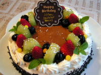 今日は息子の誕生日だったので、息子の好きなもの尽くしのバースデーケーキを作りました。息子はおやつは毎日プリンでもいいくらいのプリン星人なので、今年は@nie'sさんからアイディアをお借りして、プリンケーキに まず、18cmの丸型でジェノワーズを焼いて、2枚にスライス。間には同じく18cmの丸型で薄く焼いたプリンをはさみ、トップにはふた回り小さい12cmのプリンをのせました。周囲は生クリームでナッペし、トップの残りのスペースは息子の大好物のメロン、いちごでデコレーション。 大きなチョコプレートは先日東急ハンズで見つけたもの。転写シートつきなので、ペンタイプのチョコで書くよりもラクで、失敗なく名前やメッセージが入れられます。上の写真は完成直後のもの。この後、ちょっと寂しいかな~といろいろいじってしまい、最終的にはこうなりました↓ 息子にはミモザが硬くて食べにくいとか、ブルーベリーは酸っぱいとか言われてしまい、いじらないほうがよかったみたいです・・・(;^_^A ちなみに中身はこうなってます↑ジェノワーズ、プリン、ジェノワーズ、プリンと同じくらいの厚さの層になっていまーす。 立てるローソクの数もすっかり増えて、ケーキいっぱいになってきました。あと数年したら、もう10の位は省略、とかになってくるのかな? 息子のリクエストでメインはハンバーグ。精肉専門店で、和牛の挽き肉を買って普段より少しだけゴージャスなハンバーグにしました。肉汁たっぷりで、大人も満足♪子供はケチャップで食べましたが、大人はさらし玉ねぎ、しそ、トマトをのせ、ポン酢で頂きました。 息子のもうひとつの大好物、お刺身をサラダ仕立てに。レタス、クレソン、しそ、わかめ、玉ねぎなど野菜もたっぷり入っています。お刺身の盛り合わせ1パックを野菜で増量作戦です・・・。ステンデコ型 底取 18cm ケーキは底取タイプの型が便利。フッソデコ型 共底 18cm プリンは共底のこちらのタイプで。デコレーション型共底ブリキ12cm たまにしか使わないサイズはお手頃価格のブリキ製を使用。バースデーメッセージプレート15143 楽天でも発見!食べ甲斐のある(?)大きなチョコプレートです。