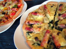 曜日の並びのせいか、いつも以上に長く感じる春休みお昼ごはん作りもあともう少しっ!麺類のリピートにも飽きてきたので、少し気分を変えようとピザを作りました。門間みかさんレシピのリーンな生地を粉300g分こね、半量は薄く伸ばしてピザ生地に。残りは、以前ジョアンで食べて感動したリュスティックを真似て、くるみ、甘栗、ドライアップルを混ぜ込んでみました。ピザはお手軽に市販のピザソースを塗って、冷凍のイタリアンベジミックス、ブロックベーコン、ブラックオリーブをのせたものと、EXバージンオリーブオイルを塗り、薄くスライスしてレンジでチンしたじゃがいも、ほうれん草、ブロックベーコン、アンチョビの粗みじん切り、薄切りにんにくを散らしたもの。冷蔵庫の中でイタリアンな香りのするものを集めてのっけた・・・という感じですアツアツ&カリカリのピザはホームメイドならではのおいしさですよね♪出来立てなら、たいていのものはおいしく感じられるしこちらが残りの生地で作ったくるみと甘栗、ドライアップル入りのリュスティック。思った以上にすぐに割れてしまう甘栗の扱いが難しくて、なかなか思い通りになりません・・・(T_T)やわらかいむき甘栗ではなく、鬼皮つきのものを使ったほうがいいのかも。(うーん、でもそうなるとちょっと面倒くさい・・・。)たかこさん&みかさんの大切な人と一緒に食べたいお菓子とパンのレシピ
