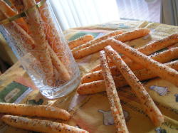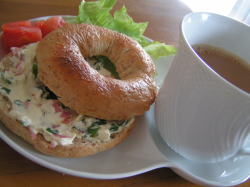 炒めた玉ねぎのスライスがたっぷり入ったベーグルです。バジルペーストを混ぜたクリームチーズを塗り、野菜をのせて頂きましたこちらはベーグルを使ったベーグルラスク。バジルペーストはこんな風に薄く切ったパンに塗って、ラスクにしても美味手前のものは、ベーグルを薄くスライスし、バジルペーストを混ぜたバターを塗って、カリカリになるまでオーブンで焼いたもの。後ろの3枚は粉チーズを混ぜたバターを塗って同様に焼いたものです。両方ともBAGEL & BAGEL オリジナル・レシピ第2集 を参考にしています。おやつにもおつまみにもOKの甘くないラスクで、適度な塩味が後をひくおいしさです焼きたてのベーグルが味わえる楽しさ!BAGEL & BAGEL オリジナル・レシピ第2集 We Love Bagel!