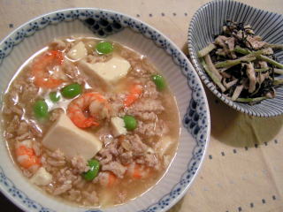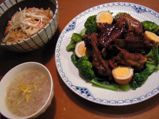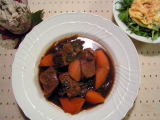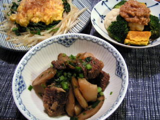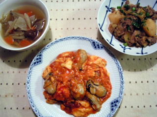栗原はるみさんのもう一度、ごちそうさまがききたくて。のレシピです。初めてレシピを見たときは、その組み合わせに、すごい発想だなぁとびっくりカキと卵とチリソースですから・・・(;^_^Aでも、食べてみると、ふっくらしたカキと、ゆるゆるの卵、甘辛いチリソースのバランスが絶妙で、ハマります~カキの季節になると毎年必ず作るおかずです。そしてカキが食べられない娘のためのもう一つのメインは、韓国風肉じゃが。たかこ@caramel milk teaさんのおもてなしランチ会のらくちんメニューブックのレシピです。和風の肉じゃがよりも香味野菜のパンチが効いていて、インパクトのある味汁物は、同じ本のレシピで、根菜のスープ。ごぼう、にんじん、大根、椎茸などが入った地味あふれる優しい味のスープです。野菜もた~っぷりとれます。もう一度、ごちそうさまがききたくて。たかこ@caramel milk teaさんのおもてなしランチ会のらくちんメニューブック