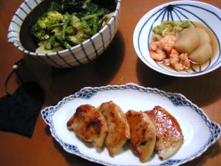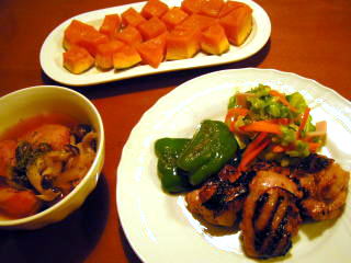 鶏のもも肉をレモンとはちみつ、塩・こしょう、オリーブオイルをあわせた調味液でマリネしてから、グリルパンでソテーしました。とっても簡単なのに、マリネしておいたおかげでお肉がふっくら柔らかく仕上がります♪大掃除を少しずつ始めているので、夕食はなるべく負担にならないメニューで、疲れを持ち越さないようにしてます(;^_^A付け合せは、グリルしたピーマンとコールスローでこちらもお手軽に。今日は冬至なので、かぼちゃも買ってきました。そのまま食べたい!という気分だったので、「雪の華」という品種をチョイス。その名の通り、皮も実も白っぽくて、ちょっとお上品な印象のかぼちゃです。一口サイズに切って、岩塩をふり、ちぎったバターをのせて、レンジでチン。シンプルな味付けでも、すごく美味しくて、素材の力があれば、あまり手をかけなくても、十分なんだなぁ・・・と実感スープも簡単に、ソーセージとしめじ、玉ねぎのコンソメスープです。夏の間はつい省いていた汁物ですが、寒くなると簡単なものでも、やっぱりあると嬉しい今日は換気扇を分解して、掃除しましたっ!オレンジページのお掃除の特集を参考にしたのですが、「目安所要時間1時間半」でしたが、やはり倍の3時間かかってしまいました・・・それでも、オレペの推奨していた「湯煎方式」は効果抜群で、前回よりかなり効率よく掃除できました。これでキッチンの大掃除はほぼ完了。ちょっと目途がだって、ホッとしてます