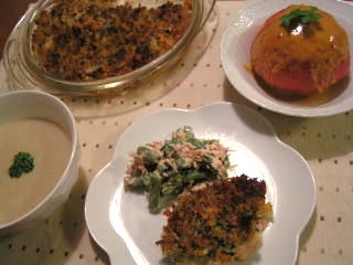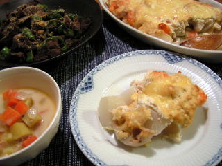 Yomeカフェレシピを参考にしました。えびや帆立ても入っていますが、それ以上にたっぷり入っているのが、れんこんとかぶ。ソースにはたらこが入るという変わった組み合わせです。こってりしたグラタンではなく、あっさりしていてどこか和風の趣き。寒い日はやっぱりこういうお料理が嬉しい♪スープは一見洋風ですが、白味噌仕立てになっています。たかこ@caramel milk teaさんのおもてなしランチ会のらくちんメニューブックのレシピです。京都の方だけあって、白味噌を使うレシピがちょくちょくあります。甘いので、洋風のスープに使っても相性がいいんですね~。新しい発見でした。奥のお皿はピーマンと牛肉のきんぴら。味付けはおしょうゆとみりん、すりごまのみのあっさり味です。牛肉と一緒だとピーマンも食べやすくなるようで、子供たちは、熱心には食べないけれど、ちょこちょこつまんで食べてました。