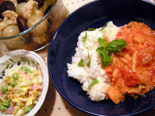 たかこ@caramel milk teaさんのおもてなしランチ会のらくちんメニューブックのレシピで作りました。トマトソースと生クリームのいいとこどりをしたようなこのソース、まろやかな酸味がおいしくて、大好きな味。パスタではなく、ご飯にかけるのは初めてでしたが、刻んだバジルとオリーブオイルを混ぜたご飯との相性もバッチリ。サラダはキャベツとコーン缶、冷凍枝豆、ハムを合わせてマヨネーズで和えた、買い置き素材でできるお手軽コールスロー。そして干ししいたけ、ペコロス、カリフラワーのマリネ。栗原はるみさんの「すてきレシピ」創刊号(当時は「暮らしのレシピ」)に載っていたものなので、もう10年以上も昔のレシピですが、いまだに我が家では冬になると必ず作っています。たっぷりの干ししいたけの旨みがしみこんだカリフラワーと小玉ねぎがホントに美味しい~。こんな組み合わせを思いつくなんて、やっぱりすごい発想力だなぁと思います(*^_^*)たかこ@caramel milk teaさんのおもてなしランチ会のらくちんメニューブック