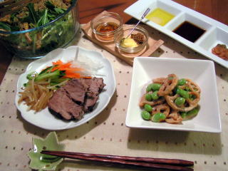 たかこ@caramel milk teaさんのおもてなしランチ会のらくちんメニューブックのレシピで作りました。ティーバッグと一緒にじっくりルク鍋で煮るだけなので、とても簡単!しっとりやわらかいゆで豚は、かたまり肉が苦手な子どもたち(特に今は兄妹揃ってグラグラになってる歯があるので)にも食べやすかったようです千切りにした野菜をたっぷり添えて、サラダのようにいただきました。たれはレシピ本に載っていたものを片っ端から試してみることに。子どもたちはひたすらポン酢でしたが、大人にはオリーブオイル&岩塩&にんにく、柚子胡椒&たたき梅などが美味しかった副菜も同じ本で、揚げれんこんと枝豆のマヨポン和えと水菜と油揚げ、じゃこのサラダ。れんこんは揚げた時点で、カリカリ好きの娘にだいぶつまみ食いされてしまいました(;^_^A子どもは和える前の、カリカリのままで食べたかったようです。同じくじゃこもごま油で炒めてカリカリにした時点で、つまみ食い部隊が・・・。 たかこ@caramel milk teaさんのおもてなしランチ会のらくちんメニューブック